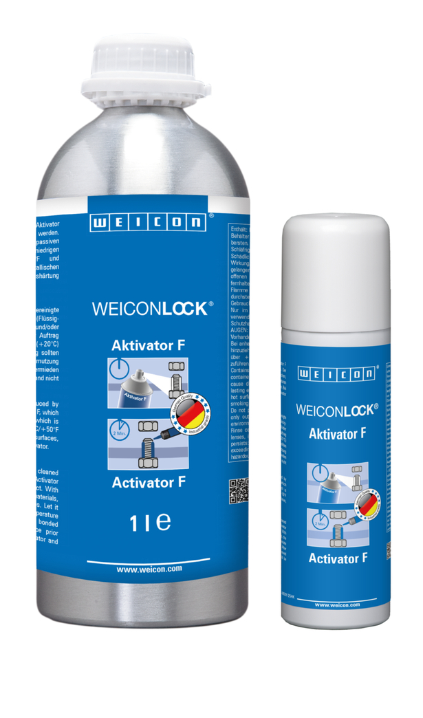 The cure time can be reduced considerably by pre-treatment with WEICONLOCK Activator F. The acticator is recommended for all passive surfaces and is indispensable at low ambient temperatures (less than +10 °C / +50 °F) and for large gaps. On nonmetallic surfaces, WEICONLOCK can only fully cure when the activator is used.