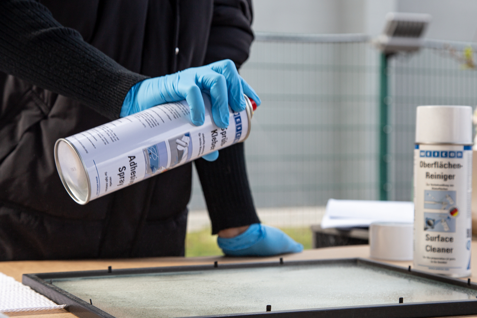 WEICON Adhesive Spray is suitable for all-purpose use and bonds light materials. WEICON Adhesive Spray is suitable for the bonding of numerous materials such as paper, cardboard, pasteboard, wood, thin veneers, cork, leather, textiles, felt, soft foam, rubber, foam rubber, and plastic film (except for PVC and polyethylene). It is especially suited for the bonding of hard foam.