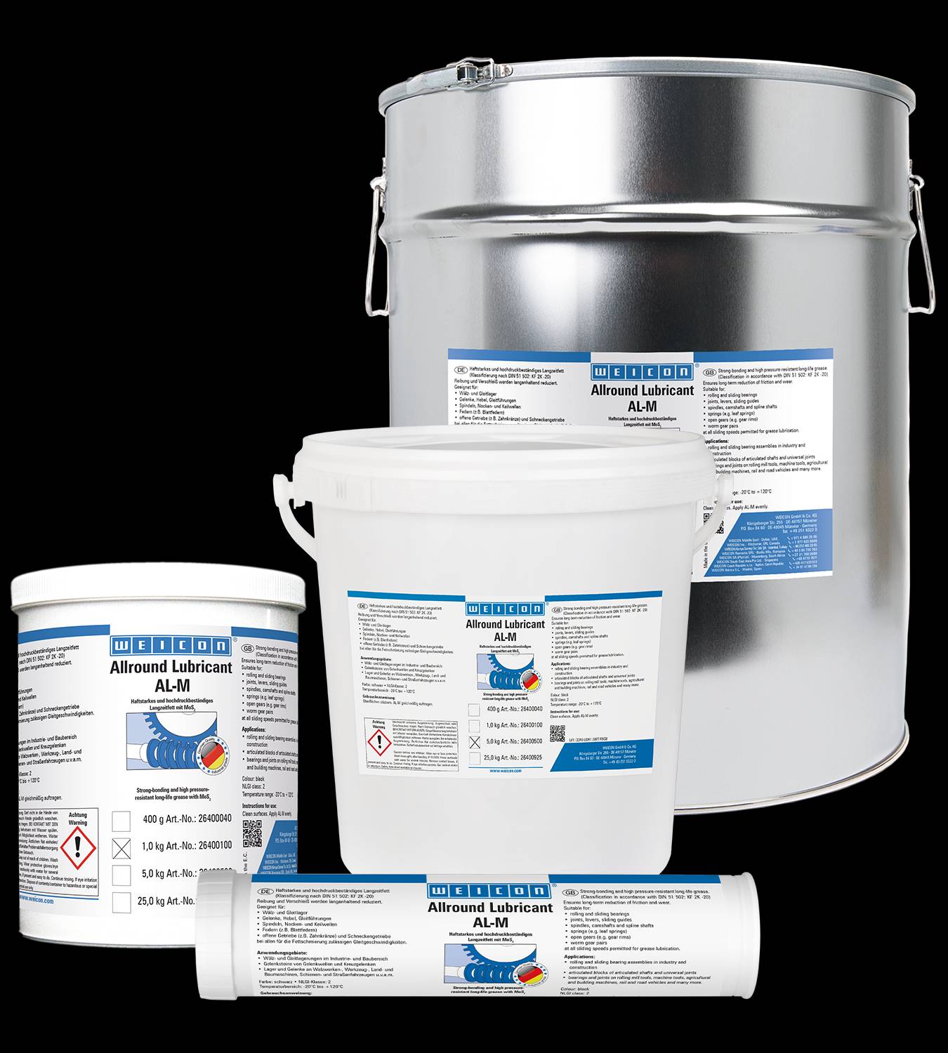 WEICON AL-M permanently reduces friction and wear and is suited for rolling and slide bearings, joints, levers, sliding guides, spindles, camshafts, spline shafts, springs, open gears, worm gears, and at all sliding speeds permitted for grease lubrication.