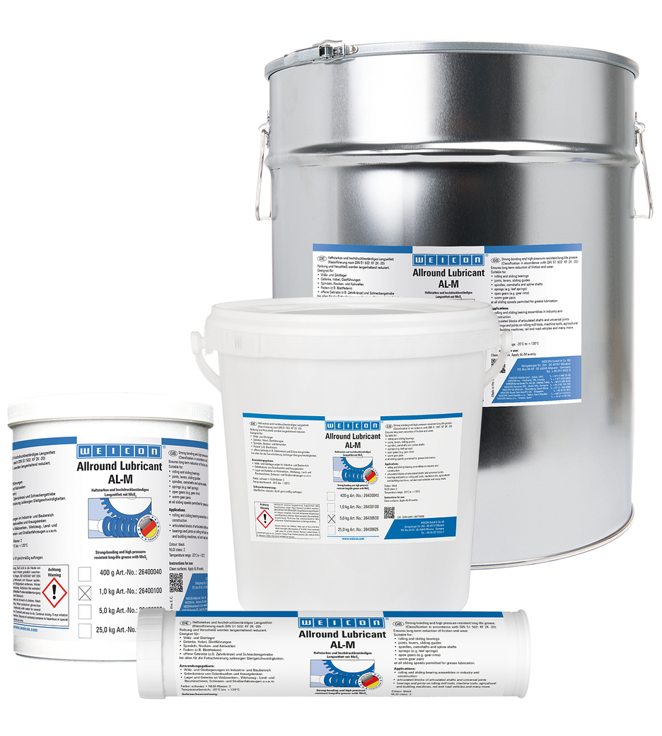 WEICON AL-M permanently reduces friction and wear and is suited for rolling and slide bearings, joints, levers, sliding guides, spindles, camshafts, spline shafts, springs, open gears, worm gears, and at all sliding speeds permitted for grease lubrication.