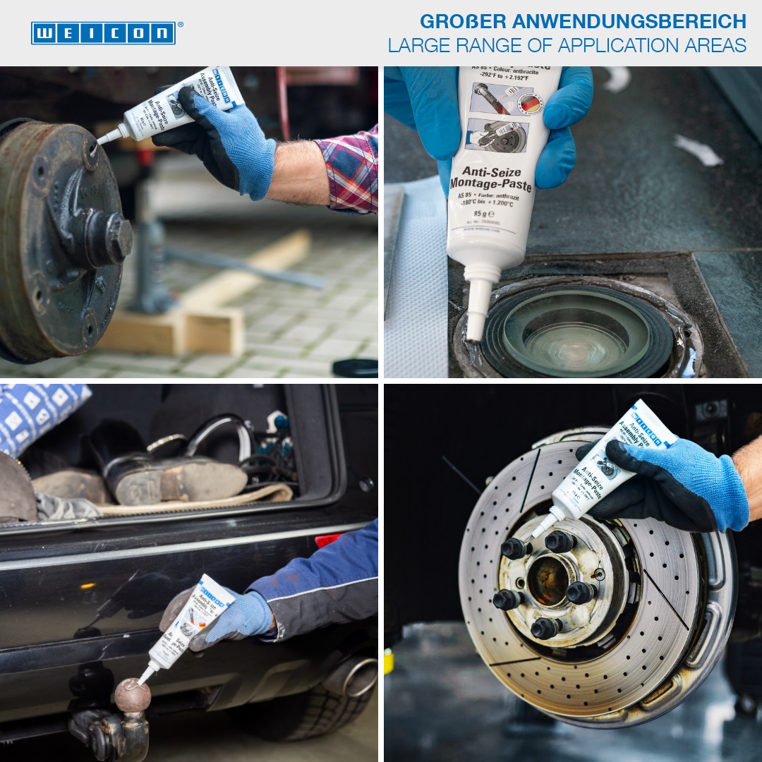 WEICON Anti-Seize is high-temperature-resistant and has excellent separating characteristics. Anti-Seize is used as a protection, realease and lubricating agent for highly stressed parts. Ideally compatible solid contents and selected additives enable a wide range of usage. WEICON Anti-Seize protects against corrosion, seizure and wear, stick-slip phenomena, oxidation, fretting corrosion and electrolytic reactions ("cold welding“).