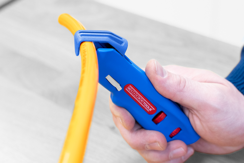 The Cable Stripper No. S 4-28 Spiral is perfect for the precise, fast and safe stripping of all common round cables with a diameter between 4 and 28 millimetres. For cables that cannot be easily stripped using circular and longitudinal cuts, the tool has an additional feature – a spiral cut, which makes it possible to easily remove complex insulation. The rotatable inner blade can be used for circular, longitudinal and spiral cuts on both soft and hard cable insulation. The cutting depth can be comfortably and precisely adjusted in 0.1 mm increments from 0-3 millimetres using a lockable adjusting screw, which prevents damage to deeper layers. The cutting blade is self-rotating and integrated into the housing, allowing for quick automatic switching between circular and longitudinal cuts – only when using the spiral cut, the blade needs to be locked in place. To perform a spiral cut, the function is switched from circular to spiral cut using a setting wheel. Then, by flipping the spiral switch, the internal blade is locked in place, and the cable stripper is ready to make the spiral cut. To switch back to the circular cut, the lock must be released using the spiral switch. The blade will then move freely again, allowing you to carry out the circular cut as usual. After performing the spiral cut, it is advisable to make a small incision at the end of the insulation. It is then easier to peel it off. The tool is equipped with a retractable hook blade for this purpose. The self-retracting safety blade is operated via a slider and automatically retracts in the event of misuse to prevent cutting injuries. This makes the use of the blade much safer compared to fixed blades, such as those in cutter knives.