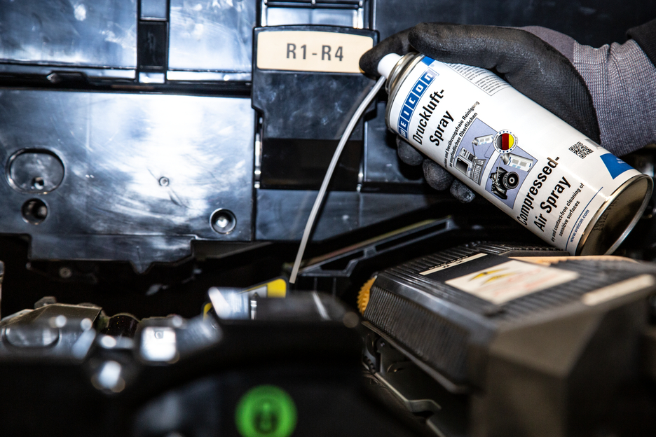 WEICON Compressed-Air Spray can be used wherever dust cannot be easily removed by conventional methods and on parts which are difficult to reach. It allows dry and contact-free cleaning of inaccessible corners and sensitive surfaces. Compressed-Air Spray can be used on HiFi and video devices (e.g. modules, circuit boards, magnetic heads, hard drives etc.), in optics (e.g. on cameras, objectives, lenses), on car fuse boxes and wiper units, on clockworks (quartz clocks), in medical technology, model making, measurement technology, on electronic components and circuit boards.