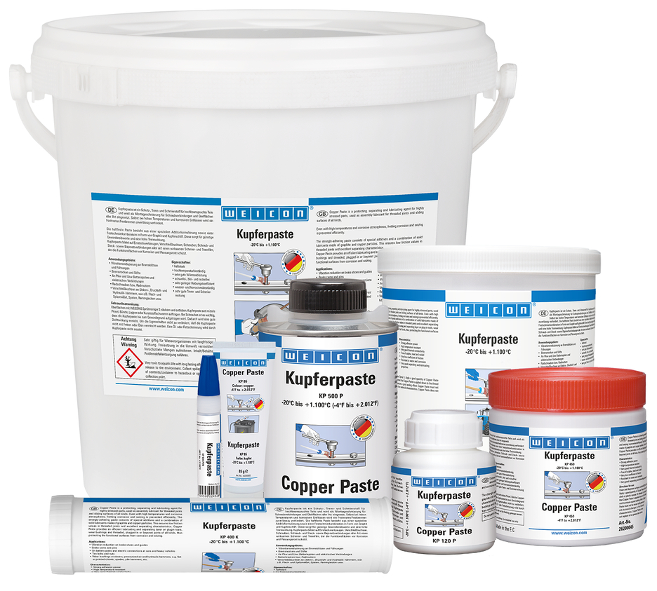 WEICON Copper Paste is a protection, release and lubricating agent, high-tempereature- and corrosion-resistant and strong. It contains no sulphur, lead or nickel. Copper Paste is used as an assembly lubricant for all kinds of threaded joints and sliding surfaces. It forms an effective lubricating and separating film, which protects the functional surfaces on plug-in tools, wear bushings, screws, and all kinds of threaded, plug-in and bayonet joints against corrosion and seizing. It can be used to reduce vibration on brake blocks and guides, brake cams and pins, car and truck battery terminals and other electrical connections, wheel bolts and nuts, and on wear bushings at electrical, compressed air and hydraulic hammers.