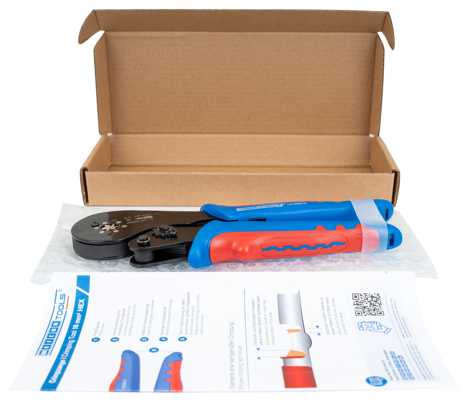 HEX-CRIMP 16 mm² has been specially developed for the process-safe crimping of wire end ferrules. Six synchronously driven dies produce a hexagonal crimp that facilitates the insertion of round terminals. The hexagonal crimp profile with serrated dies made of multi-hardened carbon steel ensures permanent electrical connections. Self-adjustment to the required wire end ferrule enables fast work with different cross-sections. The crimping tool has a ratchet mechanism with a blocking device to ensure a consistently high crimping quality and results that can be precisely repeated. The crimping tool will only open when the crimping process is complete. An emergency release has also been integrated into the handle, which opens the crimping tool in the event of misuse. Thanks to the accurate eccentric setting, the crimping force can be precisely adjusted. As a result, the tool delivers a consistently high crimping quality. The HEX-CRIMP 16 mm² tool can be used to process wire end ferrules in the working range of 0.5-16 mm² (AWG 20-5). The 2-component handles of the crimping tool ensure non-slip and ergonomically friendly handling with maximum force transmission. The tried and tested “ice-crack design” was used, which ensures a comfortable feel. The integrated eyelets on the handles can be used to attach a safety catch.