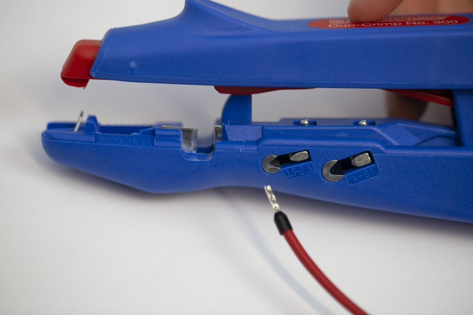 Stripping from 0.5 mm² to 6.0 mm² Two crimping areas (0.5 - 2.5 mm² and 4.0 - 6.0 mm²) according to DIN 46228-2 Integrated, well-accessible side cutter up to 6 mm²