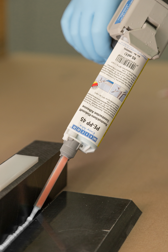 WEICON Easy-Mix PE-PP 45 is a 2-component construction adhesive based on methyl acrylate. It is particularly suitable for structural, high-strength bondings of Iow surface-energy plastics like PE, PP and TPE. Pre-treatment is not necessary, as the “integrated primer” in the adhesive activates the surfaces and enables a high-stength bonding.