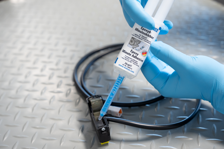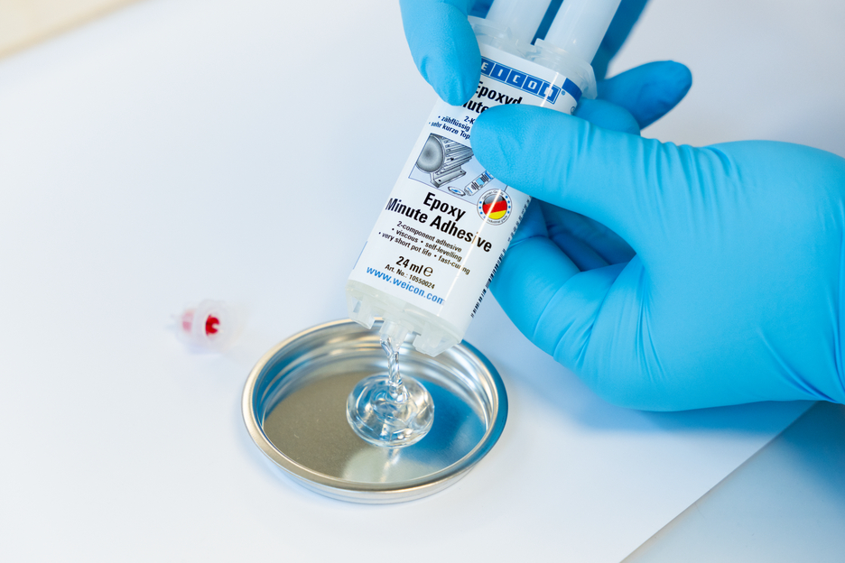 WEICON Epoxy Minute Adhesive is a universally applicable, two-component epoxy resin system. The adhesive is resistant to high temperatures up to +180 °C, viscous and self-levelling. It has a very short pot life and cures quickly. Epoxy Minute Adhesive bonds many different materials to each other, such as metal, plastic, fibre composite, ceramic, glass, stone or wood. The transparent adhesive is suitable for craft applications or demanding DIY projects. It can also be used in trade fair and shop fitting, as well as for construction and assembly work.