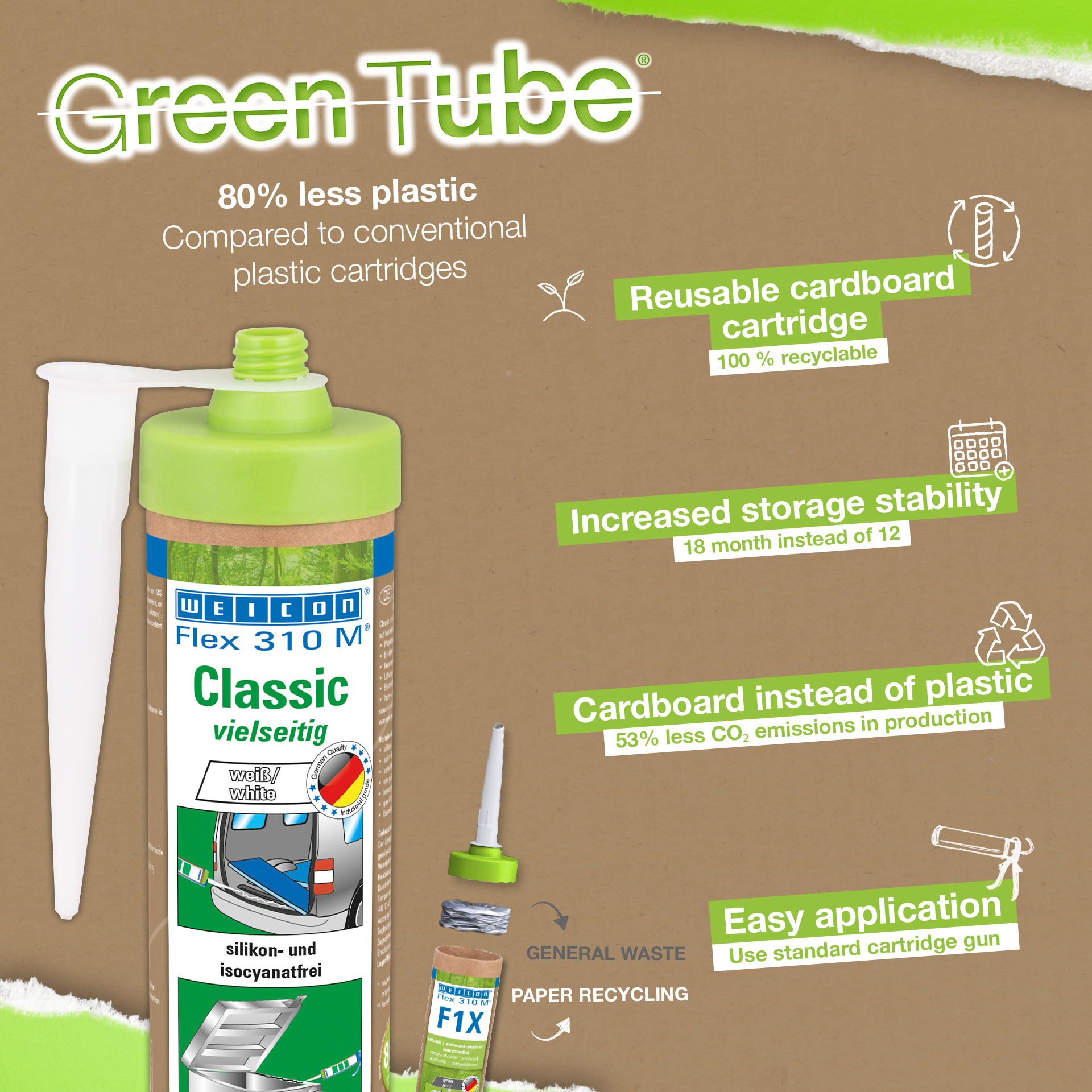 WEICON Flex 310 M Classic is strong, paintable (wet-on-wet), sandable, has an outstanding resistance to ageing and good resistance to UV rays. It is resistant to fresh and salt water and is free of silicone, isocyanate, halogens and solvents. The product as an ISEGA certificate and can be used as an adhesive in the food technology. Flex 310 M Classic is an elastic adhesive based on MS polymer and is suitable for the bonding of metals, many plastics, ceramics, wood, glass and stone. This adhesive and sealant can be used in metal construction, tank and apparatus engineering, carriage, vehicle and container construction, ventilation and air conditioning systems, in the electrical industry, yacht and boat construction, and in all applications where silicones or products containing silicones are not suitable.