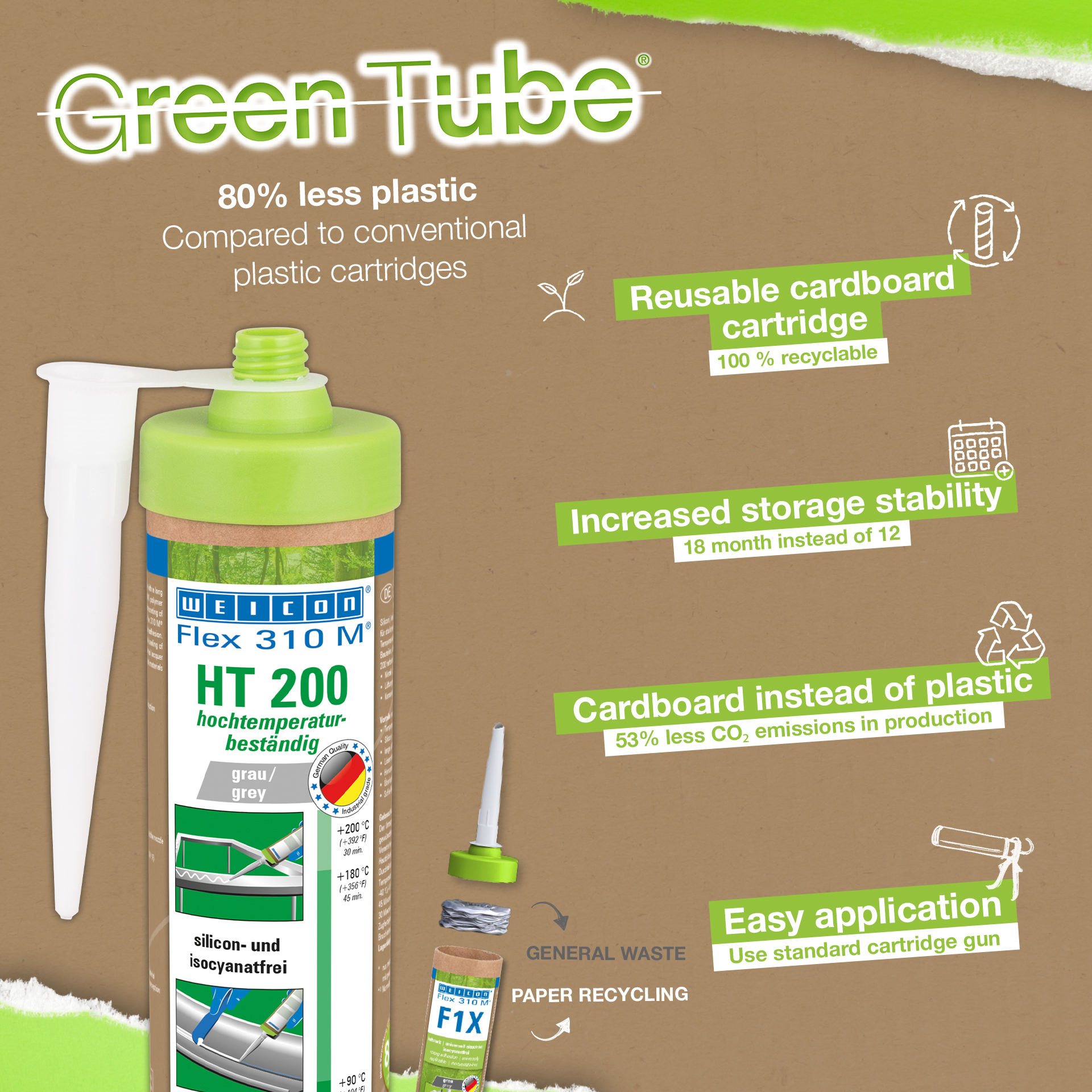 The high temperature resistance makes it possible to bond and seal components, which will be thermal-coated (powder-coated) afterwards. WEICON Flex 310 M HT 200 can be used in metal construction, tank and apparatus engineering, in ventilation and air conditioning systems, carriage, container, wagon and vehicle construction. WEICON Flex 310 M HT 200 Adhesive and Sealant is resistant even to high temperatues, has an outstanding resistance to ageing and is free of silicone, isocyanate, halogens and solvents.