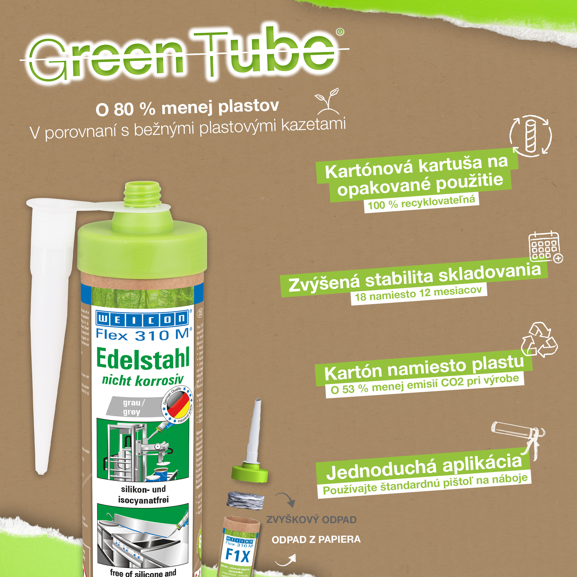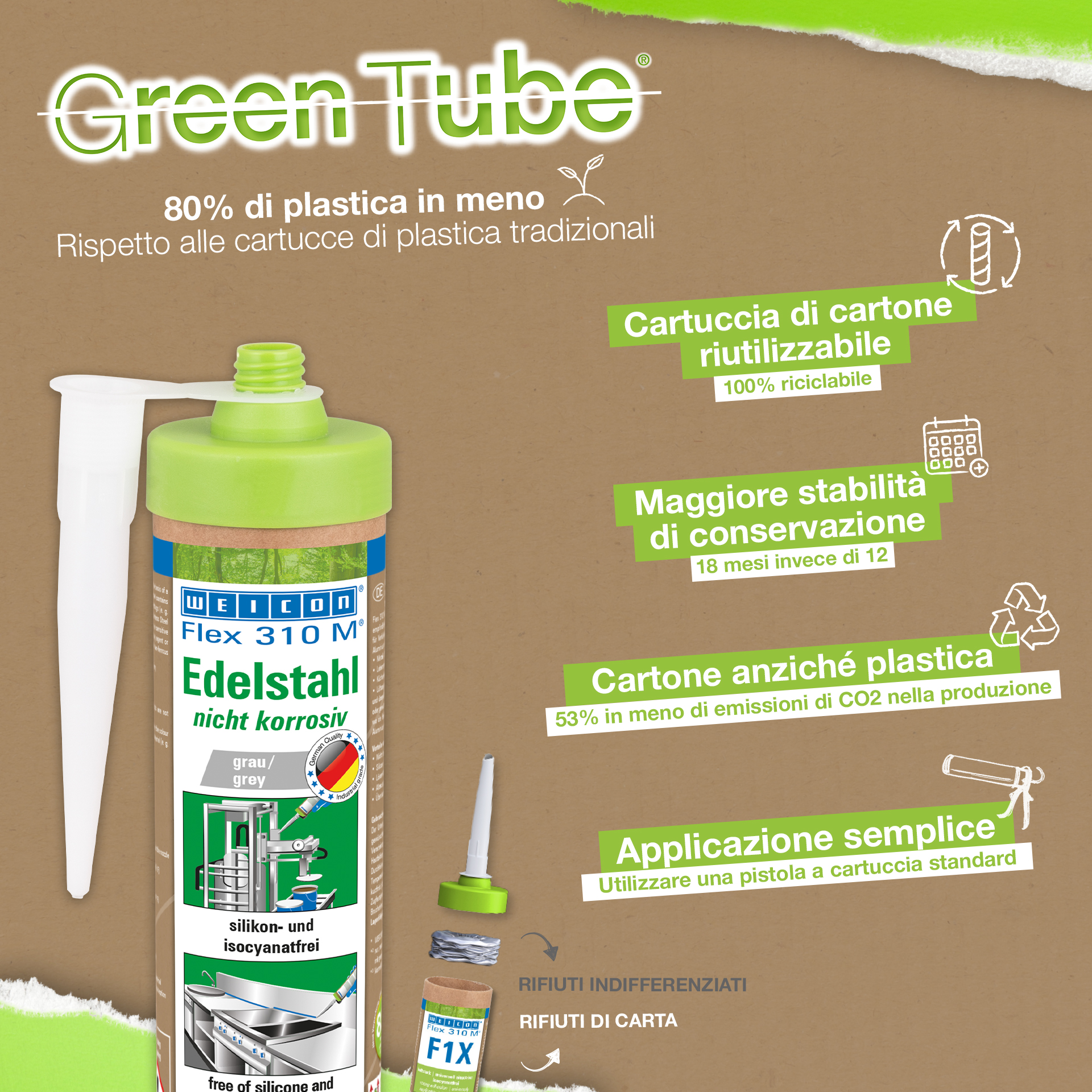WEICON Flex 310 M Stainless-Steel Adhesive and Sealant is non-corrosive, strong, paintable (wet in wet), sandable, resistant to ageing and UV radiation and is free of silicone, isocyanate, halogens or solvents. The product as an ISEGA certificate and can be used as an adhesive in the food technology. Flex 310 M Stainless Steel is an elastic adhesive based on MS polymer and is suitable for bondings as well as seam and joint sealing on metals, such as stainless steel, aluminium and non-ferrous metals. It can also be used in all application areas where the colour of the adhesive and sealant must match the surface material (e. g. stainless steel, aluminium, etc.). WEICON Flex 310 M Stainless-Steel can be used in metal construction, tank and apparatus engineering, in the food industry, in kitchen and sanitary installations, ventilation and air conditioning systems, and in all applications where silicones or products containing silicones are not suitable.