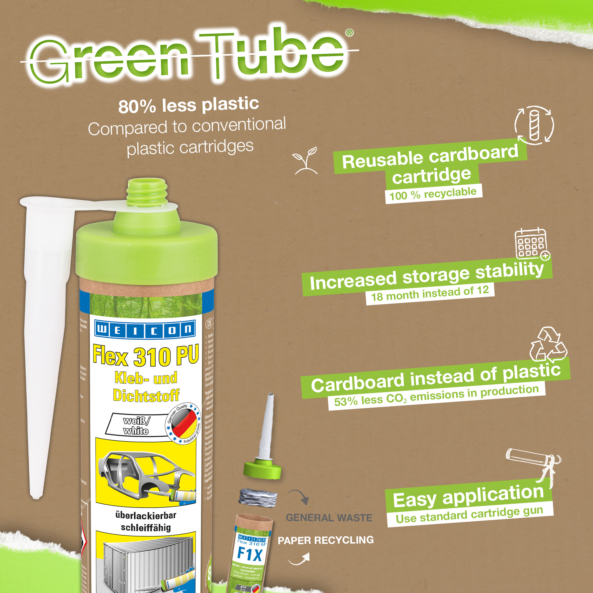WEICON Flex 310 PU is permanently elastic, strong, paintable, and resistant to weather, ageing, fresh and sea water and free of silicone. This versatile adhesive and sealant based on Polyurethane (PUR) can be used for the bonding and sealing of numerous materials such as metals, plastics, ceramics, wood, glass and stone. It can be used in tank and apparatus engineering, carriage, container and vehicle construction, in ventilation and air conditioning systems, the energy and electrical industry, and in all applications where silicones or products containing silicones are not suitable.