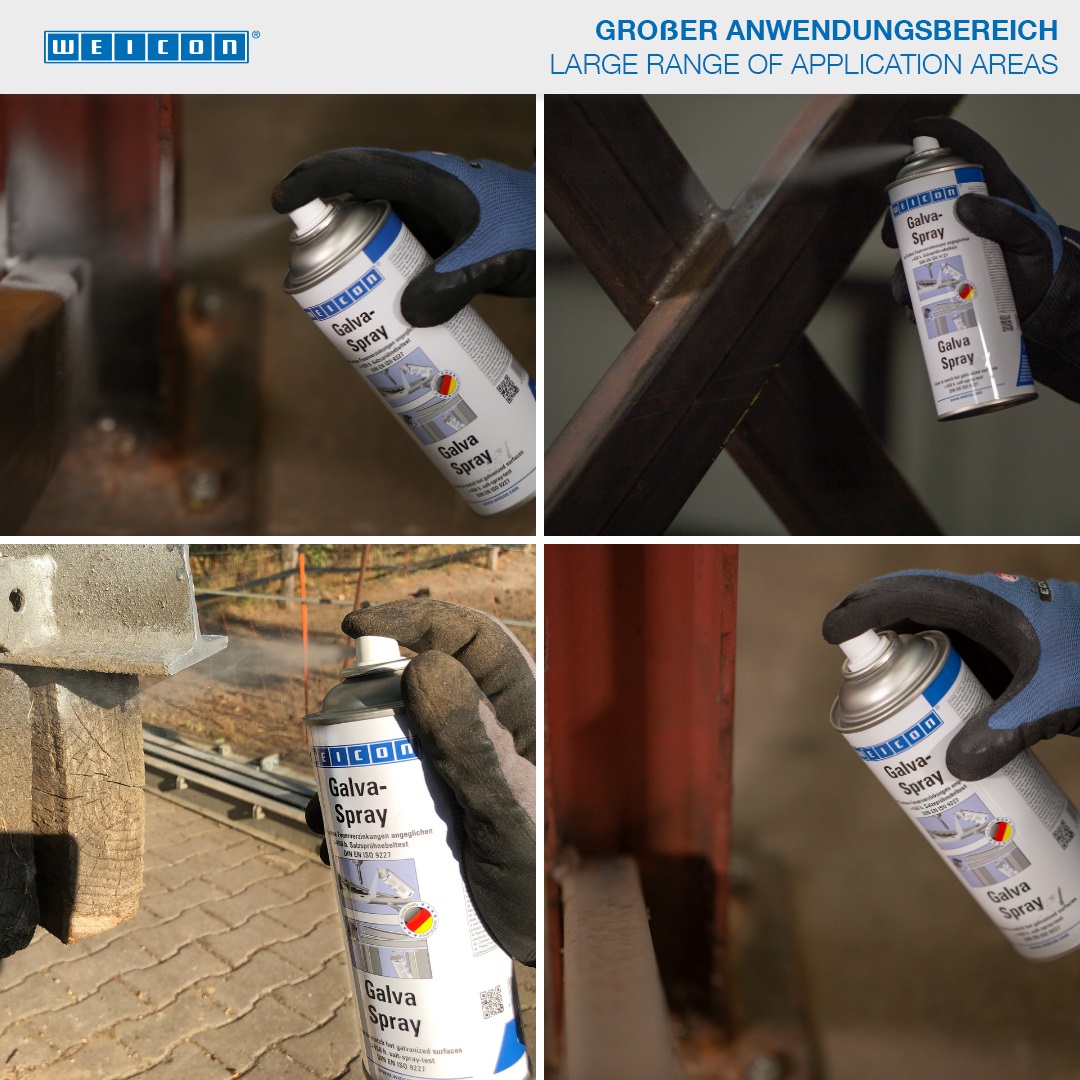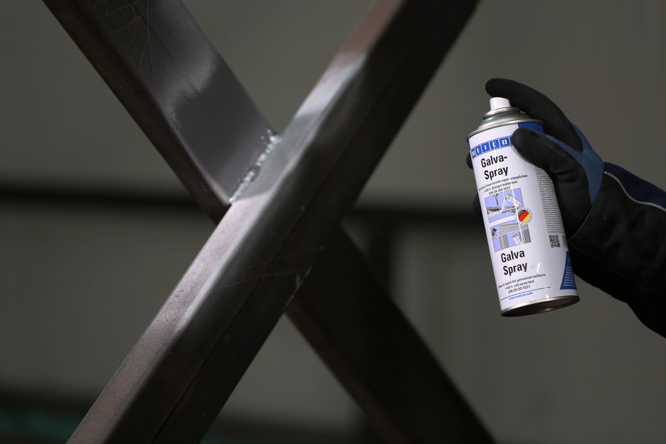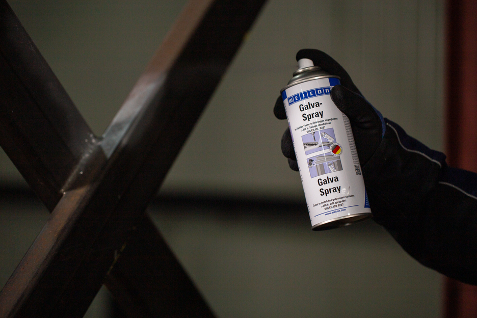 WEICON Galva Spray serves as permanent protective layer for all metal surfaces. It protects metals against rust and corrosion and is fast-drying and strongly adherent. The spray is resistant to salt water and fresh water and temperatures up to +300 °C (+572 °F). After more than 450 hours in the salt spray test according to DIN EN 9227, metal parts coated with WEICON Galva Spray did not show any corrosion. The spray can be used for repairing hot galvanized parts with matching colours, as highly effective antirust primer, e.g. for car bodypainting, as coating on welded joints and drill holes, and as conductive intermediate layer in spot-welding.