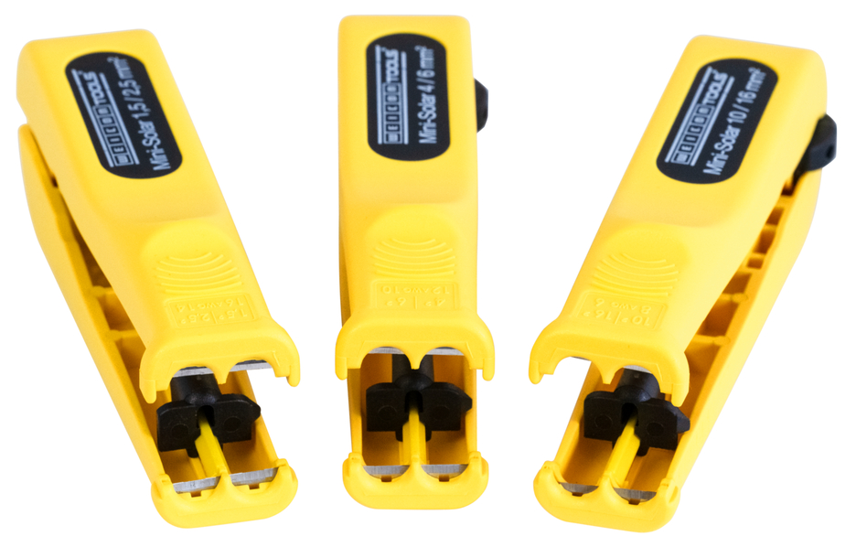 for the stripping and skinning of common photovoltaic cables (such as H1Z2Z2-K) with a cross-section of 10 & 16 mm² I with integrated side cutter