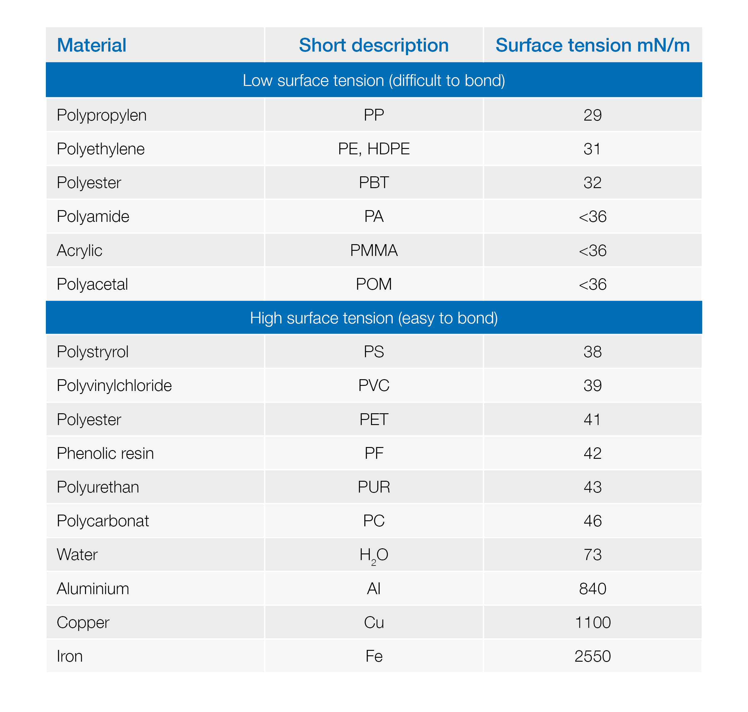 Here is an overview of plastics and their surface tension for you. Plastics that are easy to bond are therefore PVC or polycarbonate.