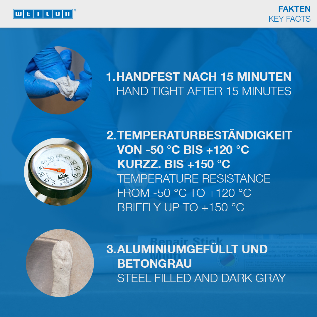 For the quick and non-corrosive repair and bonding of metal components. For the repair of cracks, holes and leaks in car bodies, gearboxes and tanks, window frames and profiles, and boats and models. The WEICON Repair Stick Aluminium can be used in machine and system construction, in the automotive industry, in gear construction, window construction, model building and many other applications.