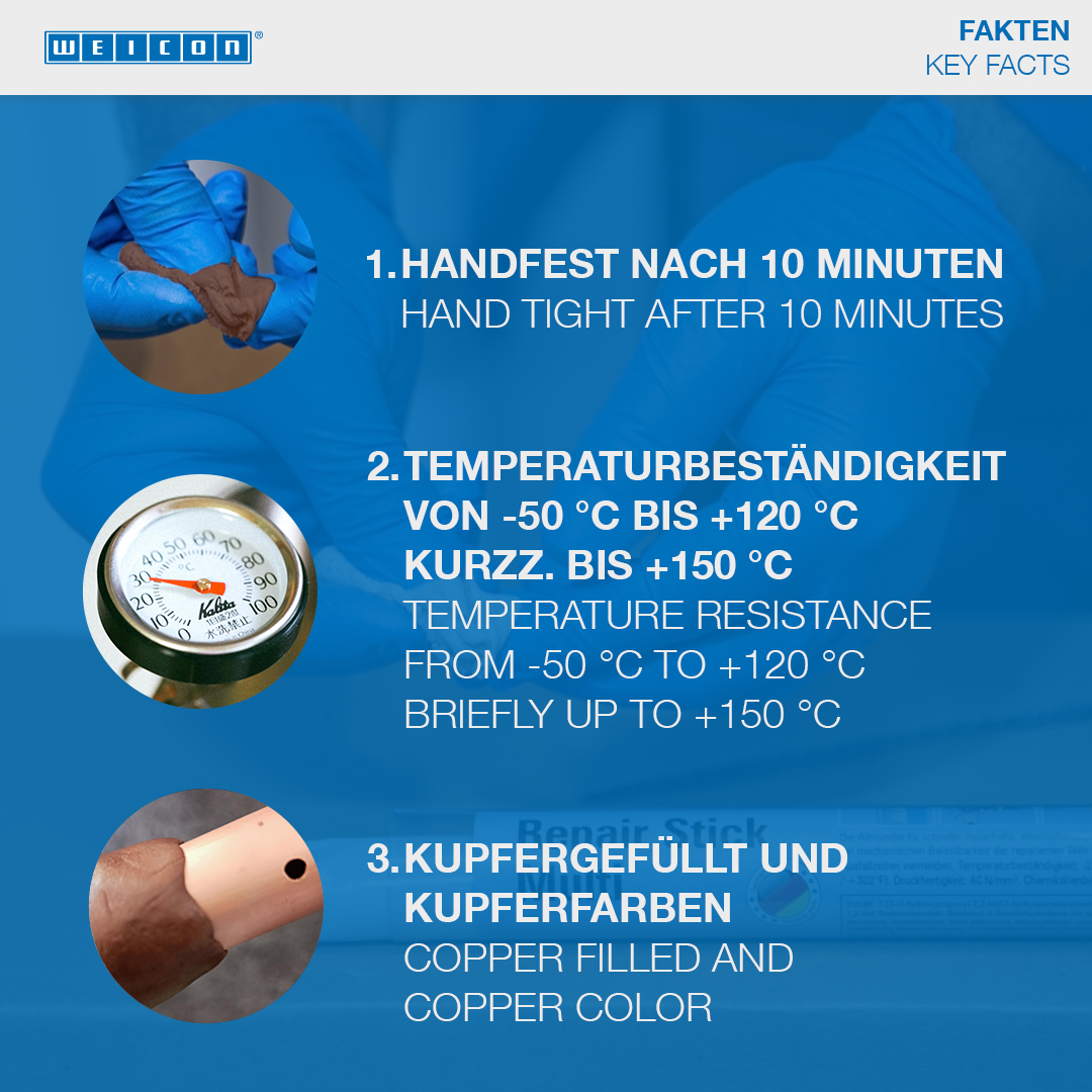 WEICON Repair Stick Copper is suitable for very quick repairs and mending of cracks, leaks and leakages. The epoxy resin system has a very fast working time of only three minutes and can also be used on damp and wet surfaces. With the stick, pipes and pipe bends, fittings and flanges, copper gutters and sheets, water heaters, water tanks, hot and cold water pipes and freezer and air conditioning systems can be repaired and mended quickly and easily. The WEICON Repair Stick Copper can be used in tank construction and apparatus engineering, in the food, cosmetics and pharmaceutical industries and in many other applications.