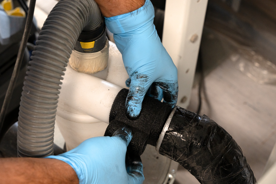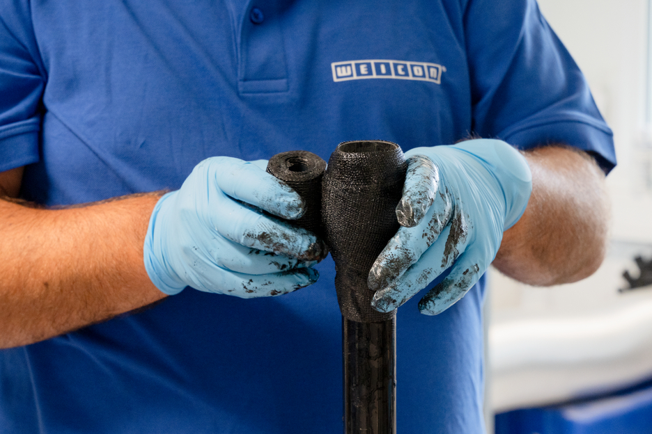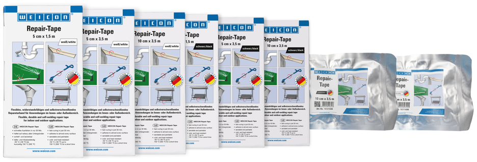 Flexible, durable and self-fusing repair tape made of fibreglass-reinforced plastic for fast emergency repairs in indoor or outdoor areas. The tape is soaked with a special resin and is activated by contact with water. It enables a very easy and fast application as well as very high adhesive strength on nearly all surfaces. After just 30 minutes, the tape is fully cured and hard-wearing. After curing, the tape can be sanded and painted. The tape can be applied without additional tools and is used for reliable and durable repairs in industrial applications, skilled trades, around the house, and in the camping and DIY sector.
