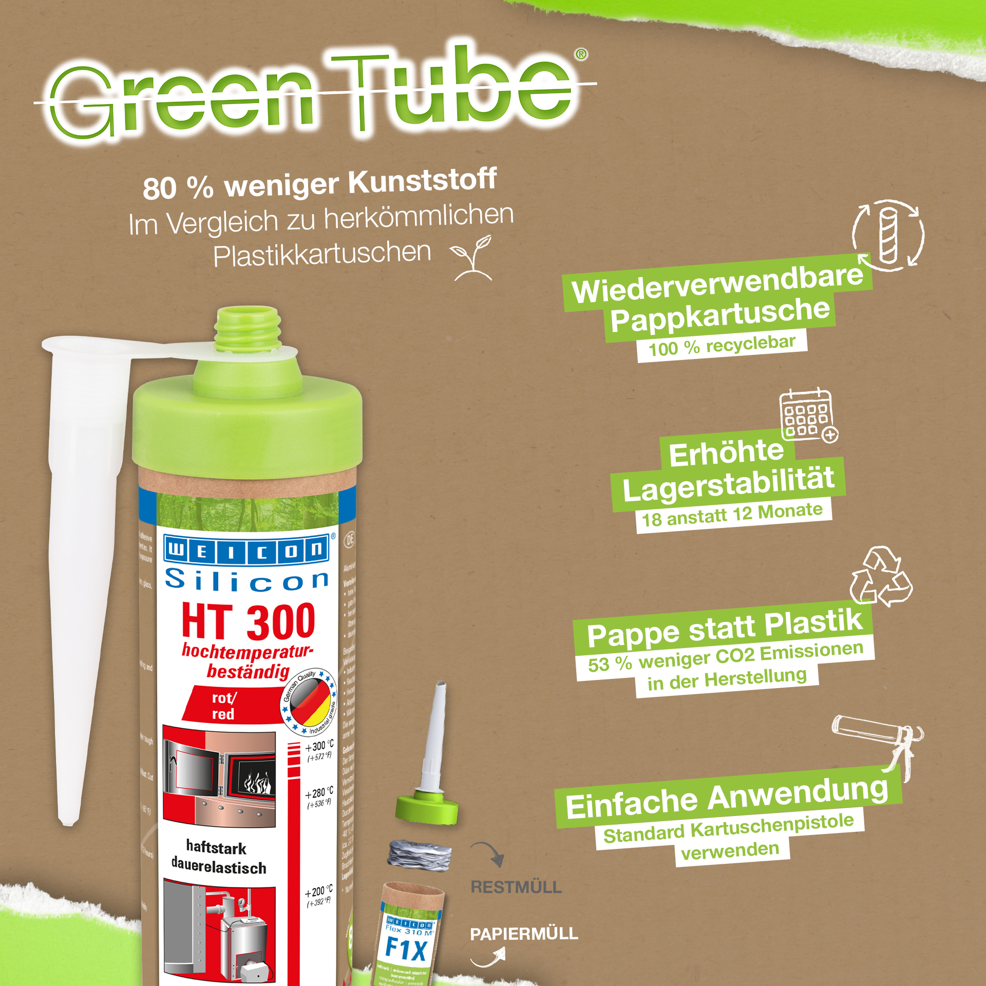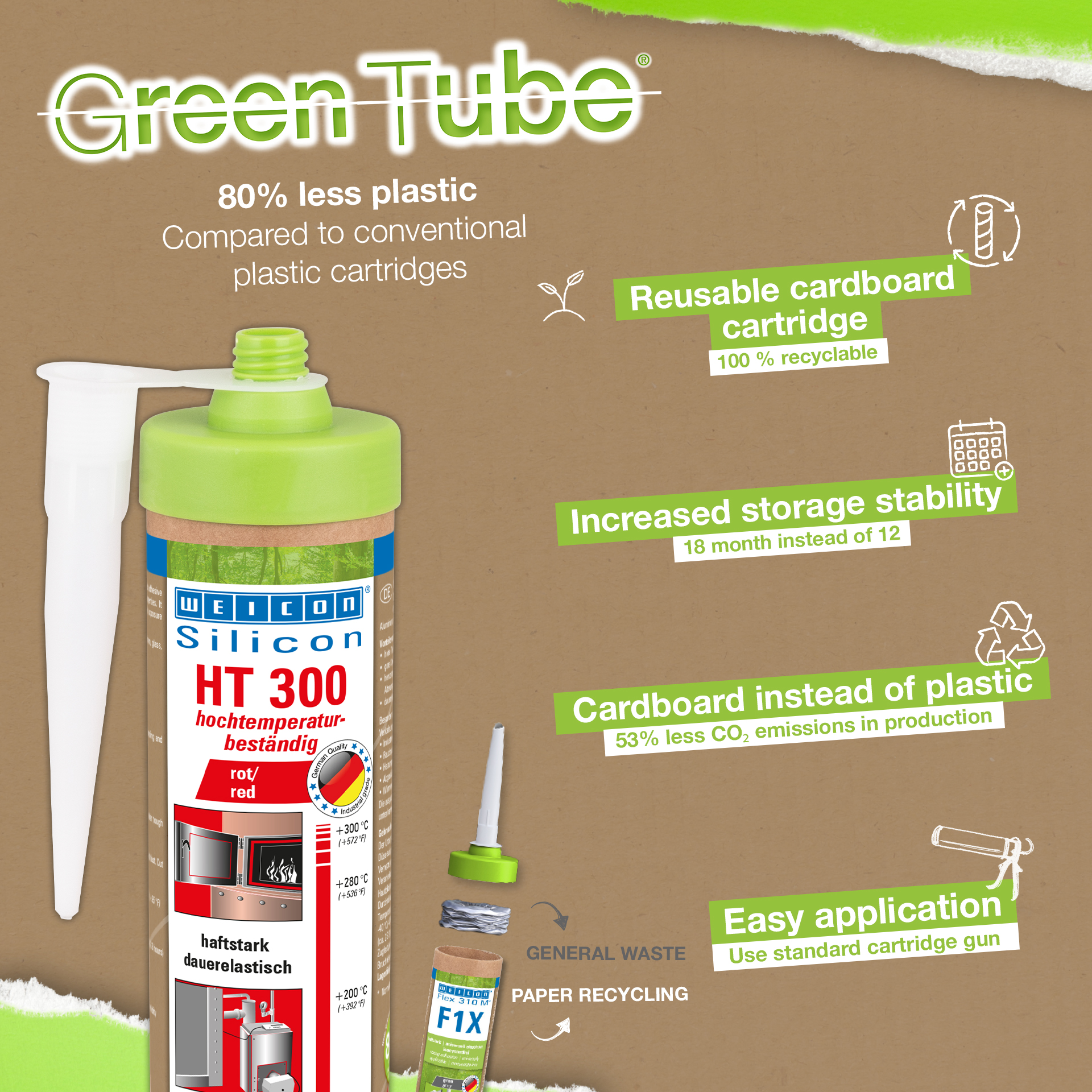 WEICON HT 300 is red, high-temperature-resistant (+300 °C/+572 °F), free of solvents, strong, and acetoxy-curing. It is resistant to weathering, ageing and chemicals and is extremely elastic (breaking elongation of approx. 300%). The product is particularly suitable for heat-exposed bonds and seals and adheres very well to steel, aluminium, glass, ceramics and many other materials. The adhesive and sealant can be used in industrial furnaces, flue gas systems, heating installations, exhaust gas routing, heating cabinets and in many additional areas.