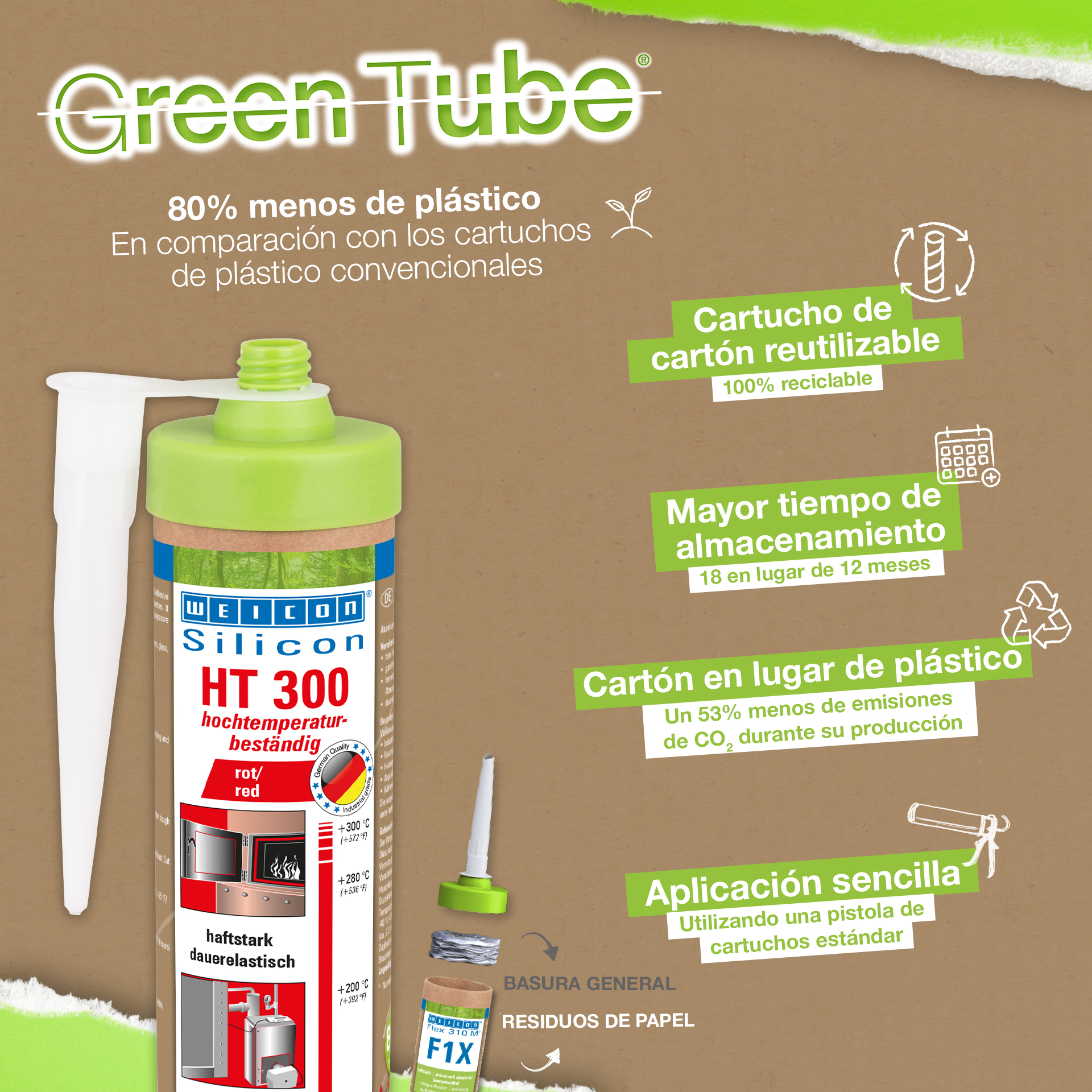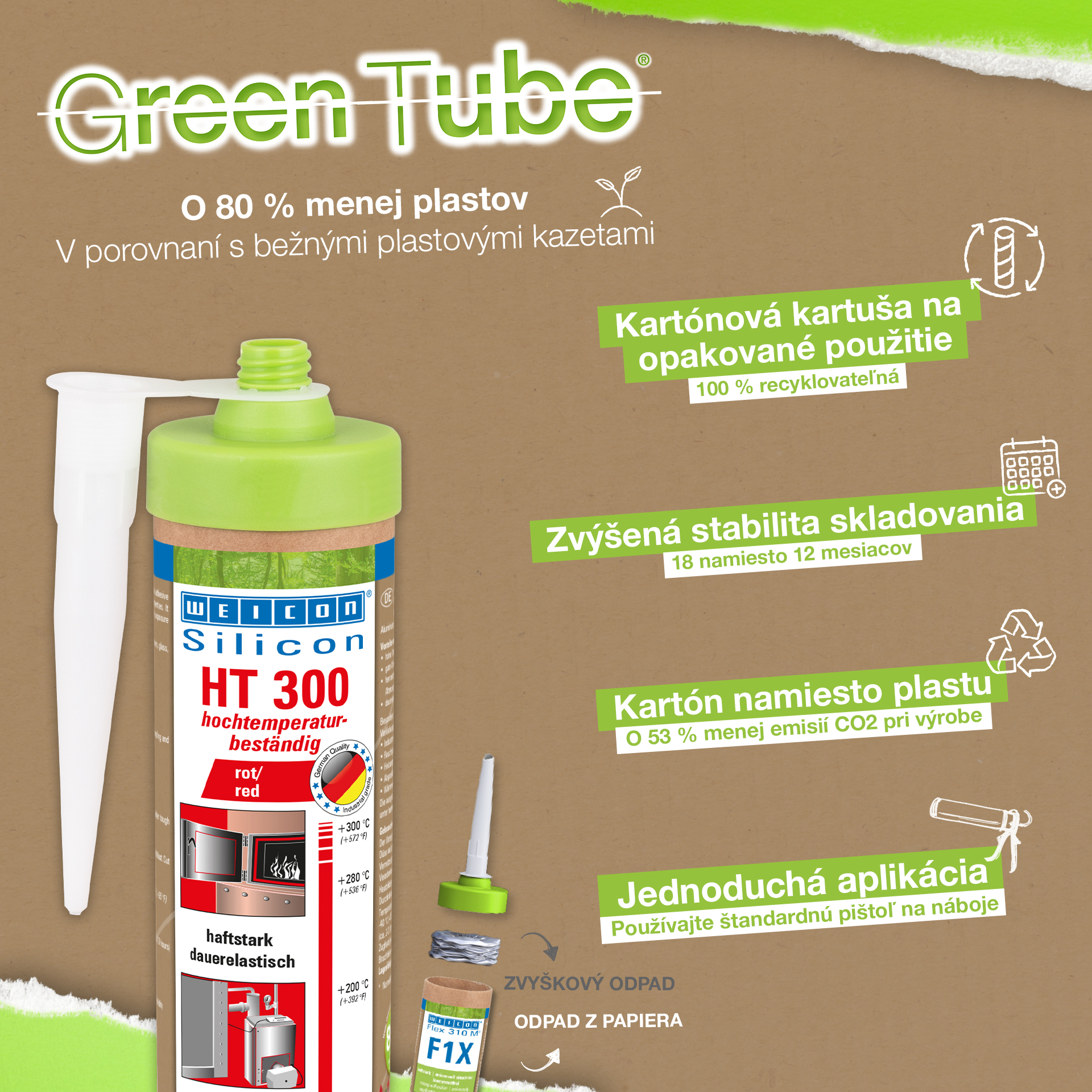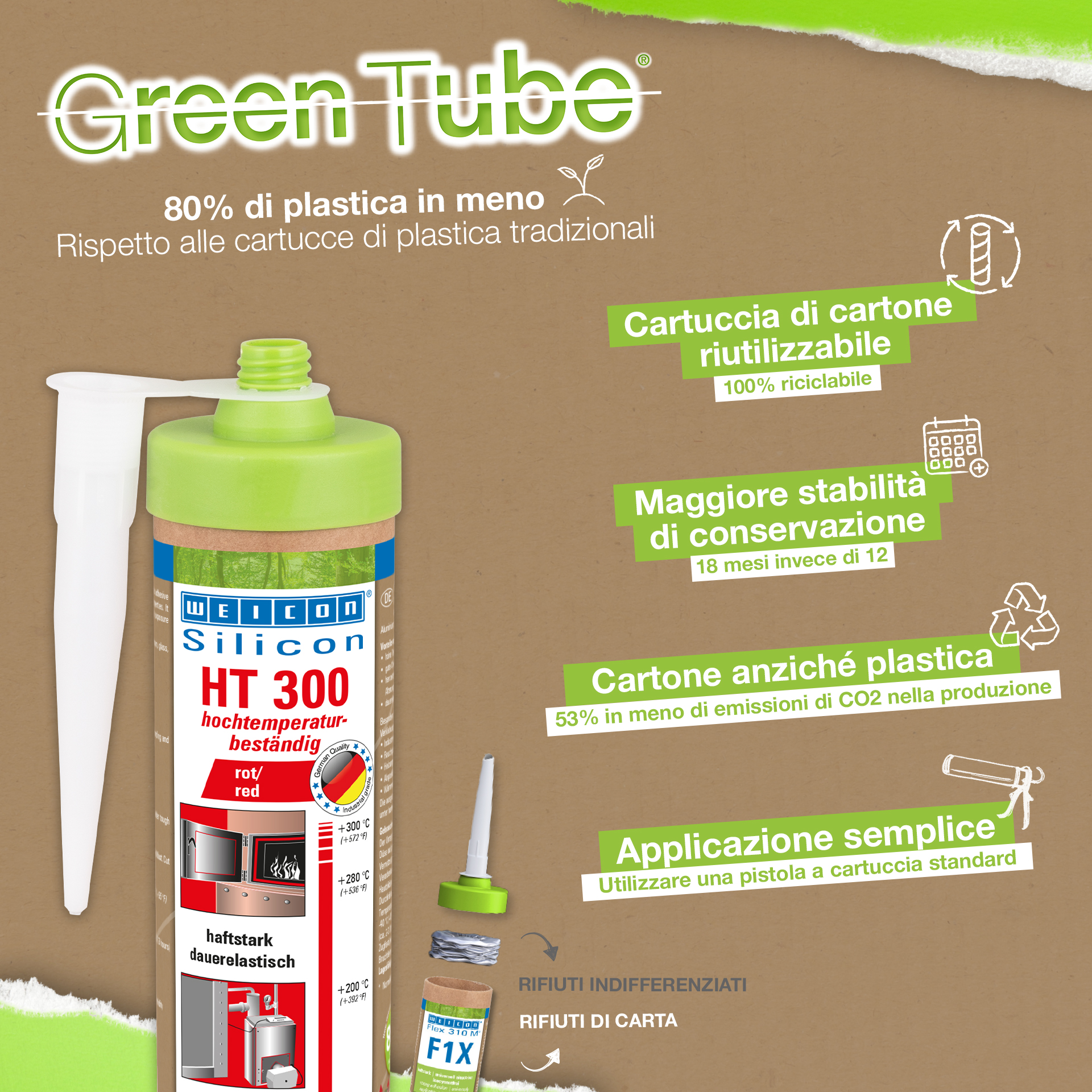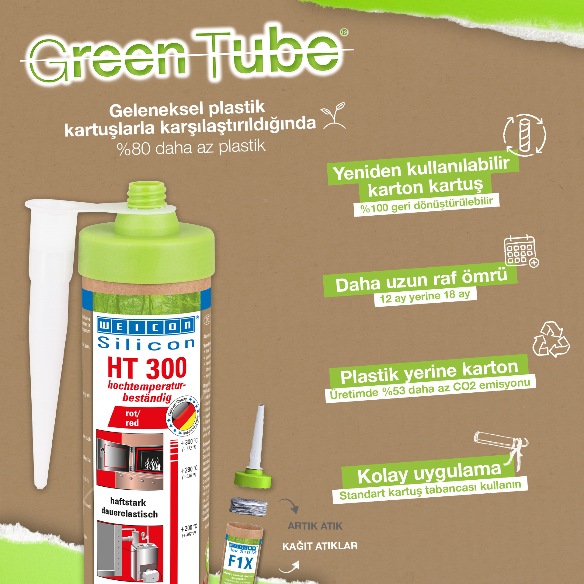 WEICON HT 300 is red, high-temperature-resistant (+300 °C/+572 °F), free of solvents, strong, and acetoxy-curing. It is resistant to weathering, ageing and chemicals and is extremely elastic (breaking elongation of approx. 300%). The product is particularly suitable for heat-exposed bonds and seals and adheres very well to steel, aluminium, glass, ceramics and many other materials. The adhesive and sealant can be used in industrial furnaces, flue gas systems, heating installations, exhaust gas routing, heating cabinets and in many additional areas.