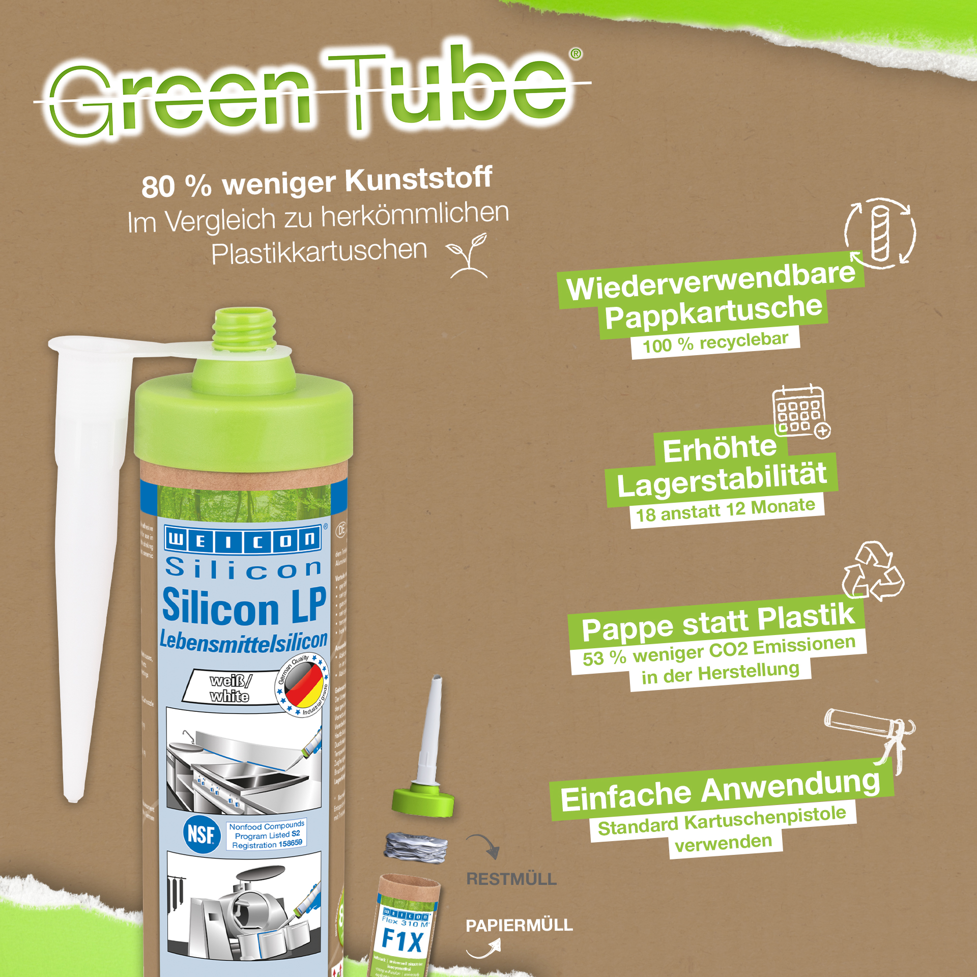 WEICON Silicone LP is an acetoxy curing and permanently elastic adhesive and sealant. It is resistant to chemicals, ageing, weathering and UV radiation and has a high temperature resistance up to +180 °C (+365 °F). It adheres very well to steel, aluminium, glass, plastics and many other materials. Silicone LP was developed specially for use in sensitive areas. It can be used as sealant in the food and drinking water sector, for example in dairies, slaughterhouses, in the food and beverage production or in canteen kitchens. Tested by the Ruhr Region Institute of Hygiene ("Hygiene-Institut des Ruhrgebiets”) according to the Guideline for Hygienic Assessment of Organic Materials in Contact with Drinking Water (KTW Guideline) by the Federal Environment Agency.