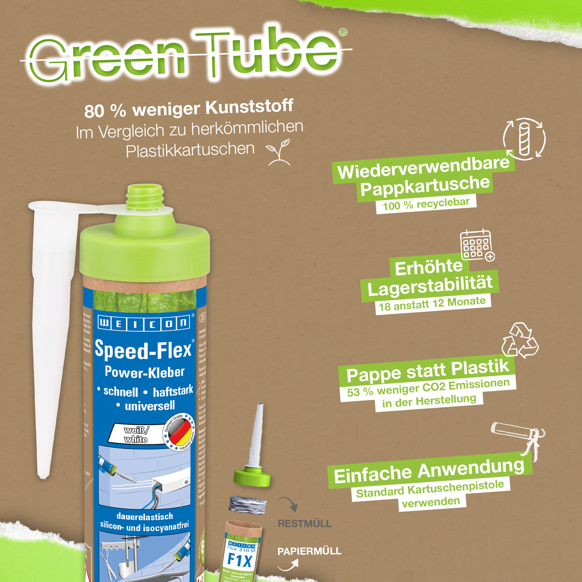 WEICON Speed-Flex is very strong, pasty, stable, paintable (wet in wet), resistant to ageing, weathering, and UV rays and free of silicone, isocyanate, halogen and solvents. WEICON Speed-Flex has an ISEGA certificate and can be used as an adhesive in the food technology. It is an adhesive and sealant based on MS polymer with extremely high initial strength and is suitable for the bonding of metals, many plastics, ceramics, wood, glass and stone. Speed-Flex replaces traditional fixings such as screws, pegs, rivets, etc. The very high initial strength makes bonding possible even on vertical surfaces in indoor and outdoor areas. The product can be used for drywall and interior work, metal construction, tank and apparatus engineering, in ventilation and air conditioning systems, in exhibition construction and shopfitting and in all applications where silicones or products containing silicones are not suitable.