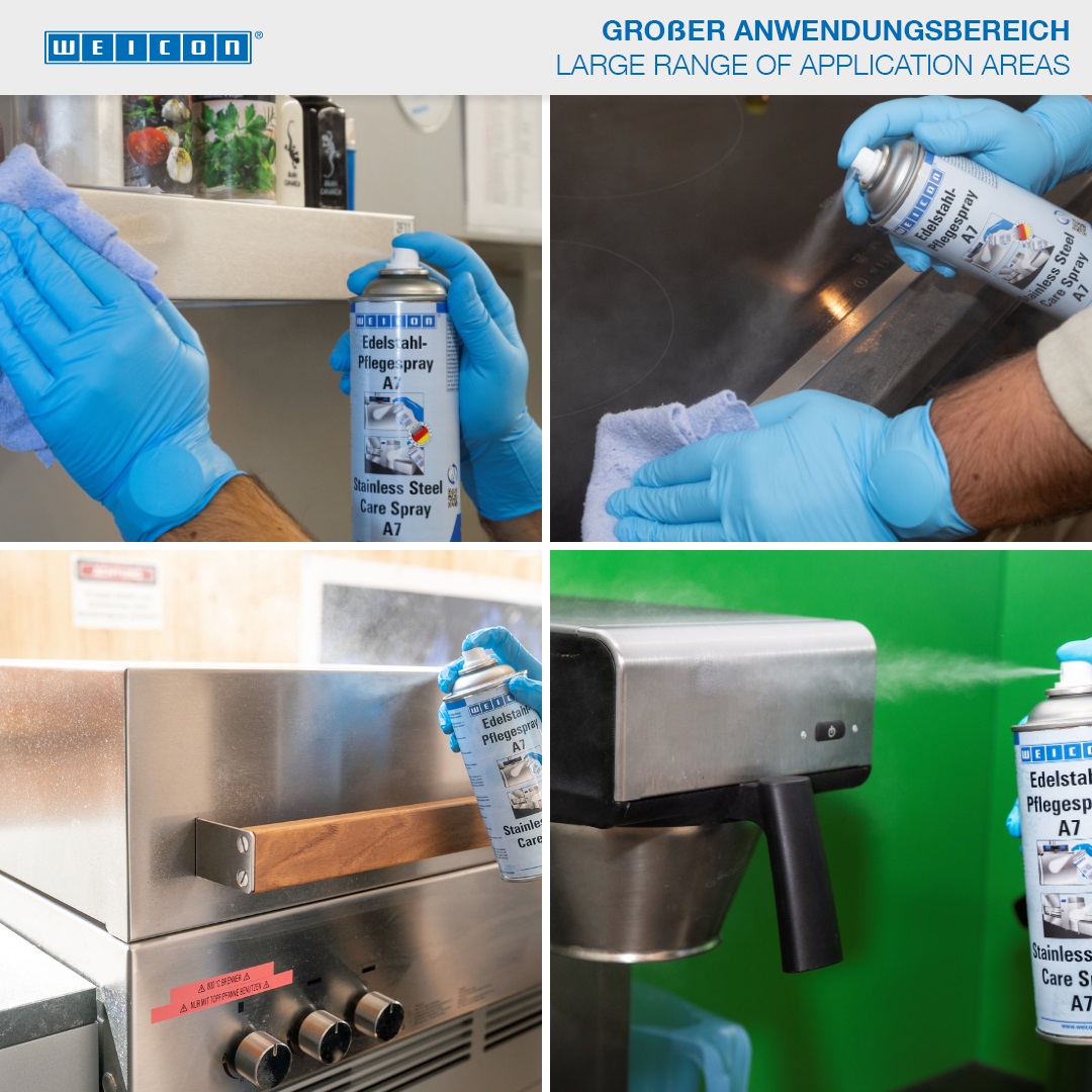 Stainless Steel Care Spray was specially formulated for the cleaning, protection and care of brushed, matt and polished stainless steel surfaces in sensitive areas. The special spray can be used in the food and beverage industry, in canteen kitchens as well as in the pharmaceutical and medical industry. The spray has an NSF registration (A7) and can be used in food processing areas. It removes smudges and fingerprints, reduces oxidation and corrosion, cleans even larger surfaces streak-free, leaves a long-lasting protective layer, and makes water roll off. It has an antistatic effect and adheres even to vertical surfaces.