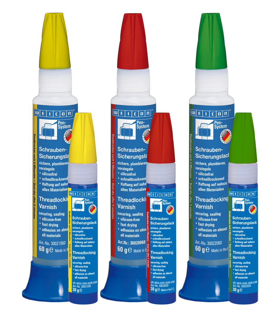 WEICON Threadlocking Varnish is a solvent-based, fast-drying securing and marking varnish with good adhesion to many materials. It serves as a removable lock, as protection against tampering by unauthorised persons, as a cover for electrically conductive parts and as protection against corrosion and influencing through contact. The product is resistant to water, petrol, diesel, mineral oil, paraffin oil and diluted acids and lyes. Threadlocking Varnish is essential for locking screw connections of all kinds, protecting against manipulation and unauthorised loosening of screws and connections, documenting quality assurance measures, production control and product inspection through a varnish seal and also for the visual inspection of connected, adjusted parts. Available in yellow, green and red.