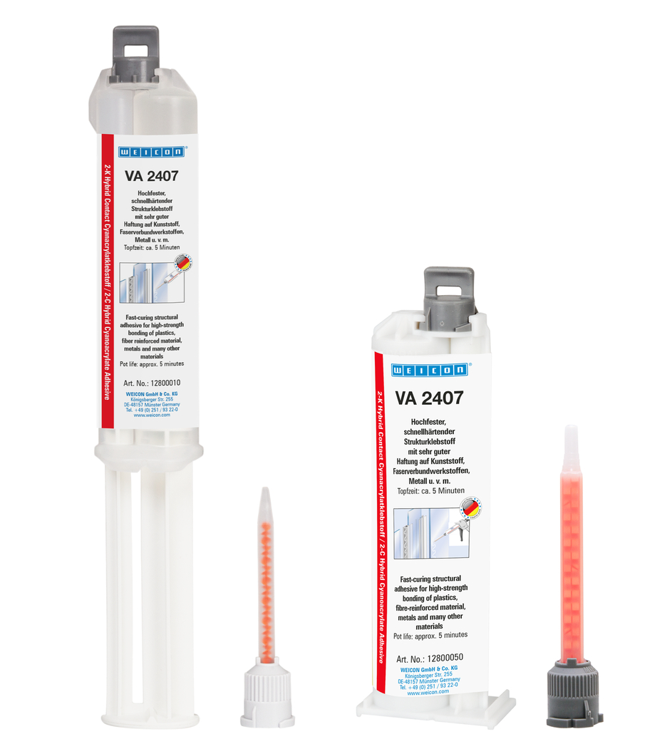 VA 2407 is a colourless and crystal clear curing two-component cyanoacrylate adhesive for bonding a wide variety of materials with and to each other. It adheres very well to many plastics (e.g. polycarbonate), steel, stainless steel, aluminium, ceramics, glass and rubber. The newly developed adhesive combines the advantages of instant adhesives with the process reliability of 2-component adhesives. The high-strength and fast-curing structural adhesive is sandable and paintable after approx. 25 minutes. It is resistant to weathering, many aggressive chemicals, impact stress and vibration. It is temperature-resistant from -20 °C to +120 °C (-40 to +248 °F). Depending on the geometry of the bond, gaps of up to 5 mm can be covered with VA 2407. Due to its fast and impact-resistant curing, it is particularly suitable for bonding e.g. plastic and rubber. It can also be used for structural adhesive bonding, where a coloured adhesive joint would affect the overall appearance of the component. VA 2407 bonds transparent plastics together, like Plexiglas and other materials, in a clean and visually appealing way. The adhesive is suitable for a wide variety of applications in plastic technology, mechanical construction, model and mould construction, metal construction, ship and boat building, bodywork and vehicle construction, trade fair and exhibition construction and many other areas of industry.