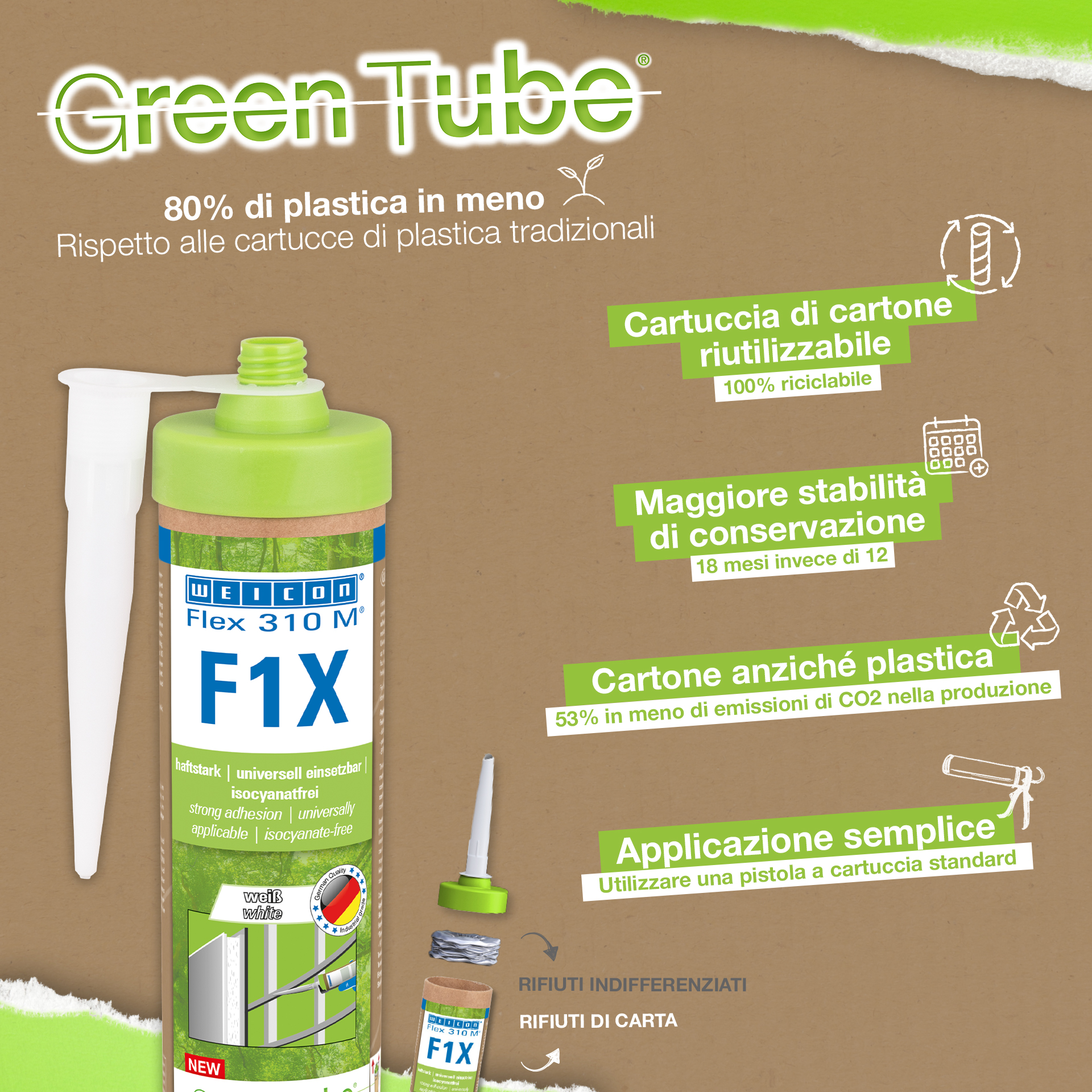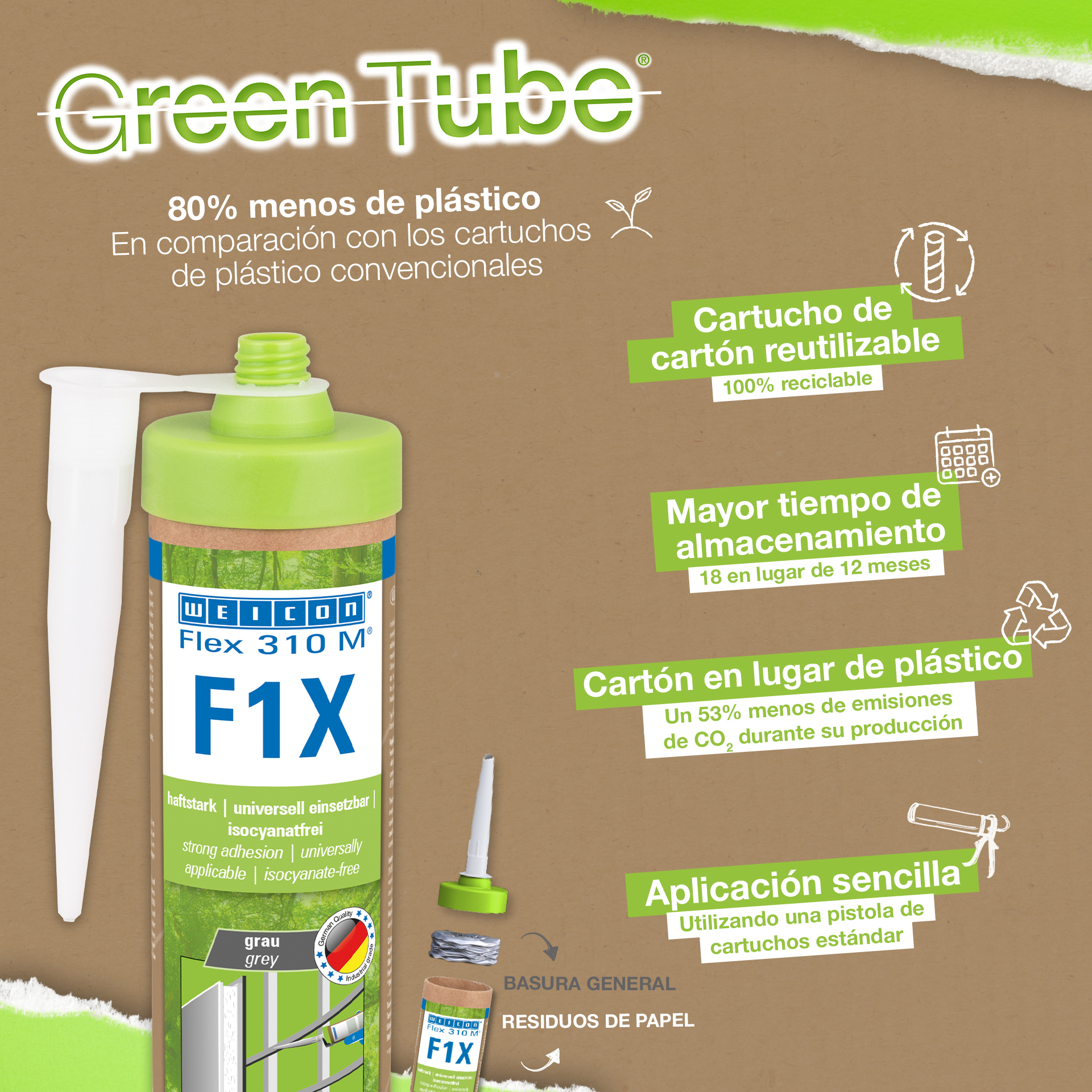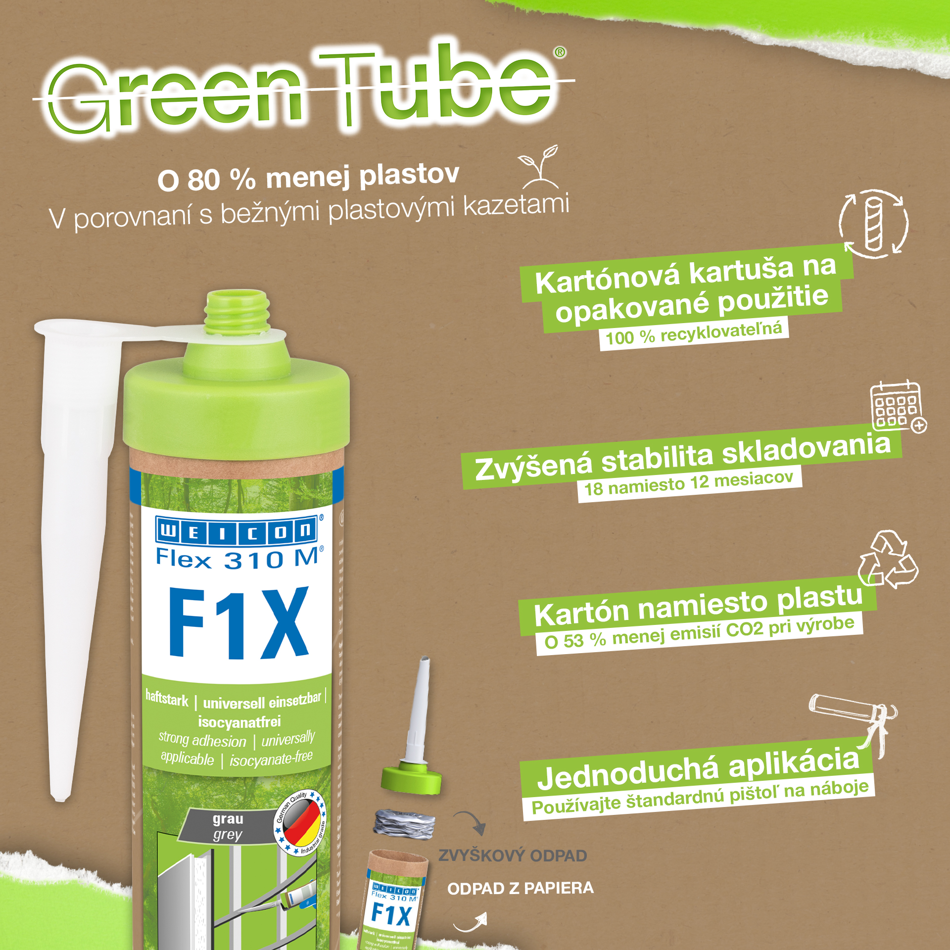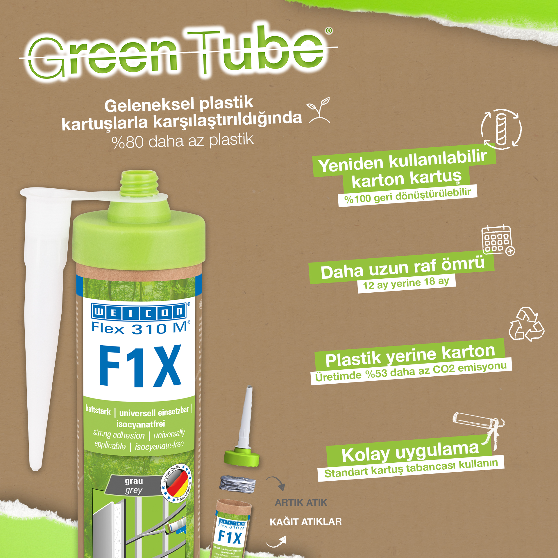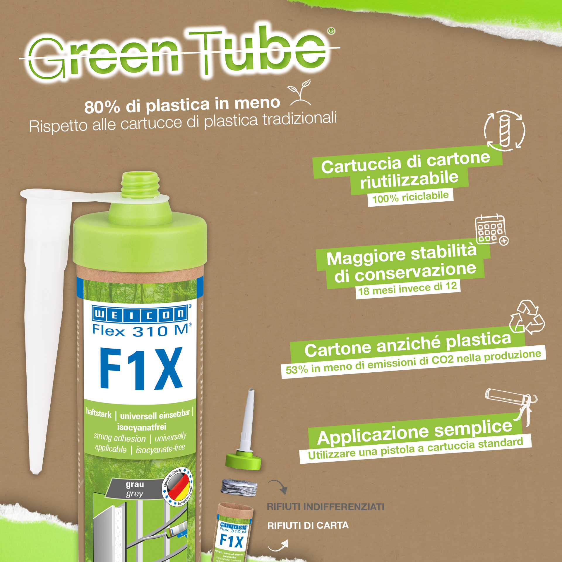 WEICON Flex 310 M F1X is an elastic adhesive and sealant based on MS polymer. The grey adhesive is very strong and universally suitable for permanently fixing almost all materials to a variety of surfaces. Thanks to the very high initial adhesion, bonding is possible on vertical surfaces and even overhead, both indoors and outdoors. For example, Flex 310 M F1X can be used to bond metals, many plastics, ceramics, wood, glass and stone to each other. The permanently elastic adhesive can be painted over “wet on wet”, is sandable, weather-resistant, moisture-resistant, ageing-resistant, mould-resistant and UV-resistant. It is briefly (up to 30 minutes) resistant to temperatures up to 180°C and can be powder-coated after a curing time of four days. The adhesive and sealant is free of silicone, isocyanates, halogens and solvents and is non-corrosive. Flex 310 M F1X can be used for fixing skirting boards, acoustic panels, strips, frames, panels, boards, tiles, stones and EPDM foil. It can be used in drywall and interior construction, metal construction, tank and apparatus construction, container construction, ventilation and air conditioning technology, trade fair and shop construction, yacht and boat building and wherever silicones or products containing silicone are not suitable. Eco-friendly packaging – same strong performance! Green Tube, the sustainable packaging: the tip and lid are made from 100% recycled plastic, and the cartridge body is made entirely of cardboard. This means lower CO₂ emissions and reduced plastic use compared to conventional cartridges – all without compromising on performance!