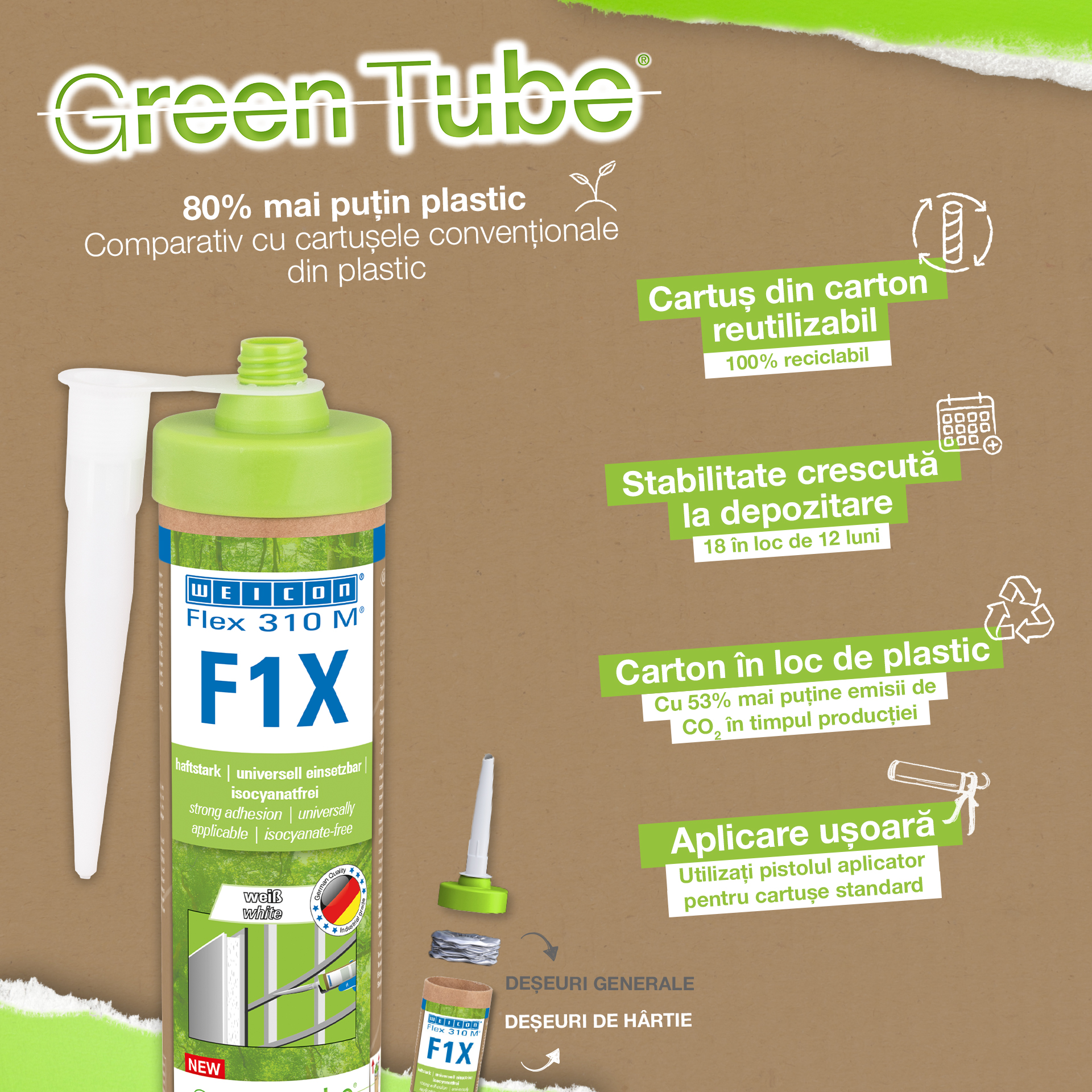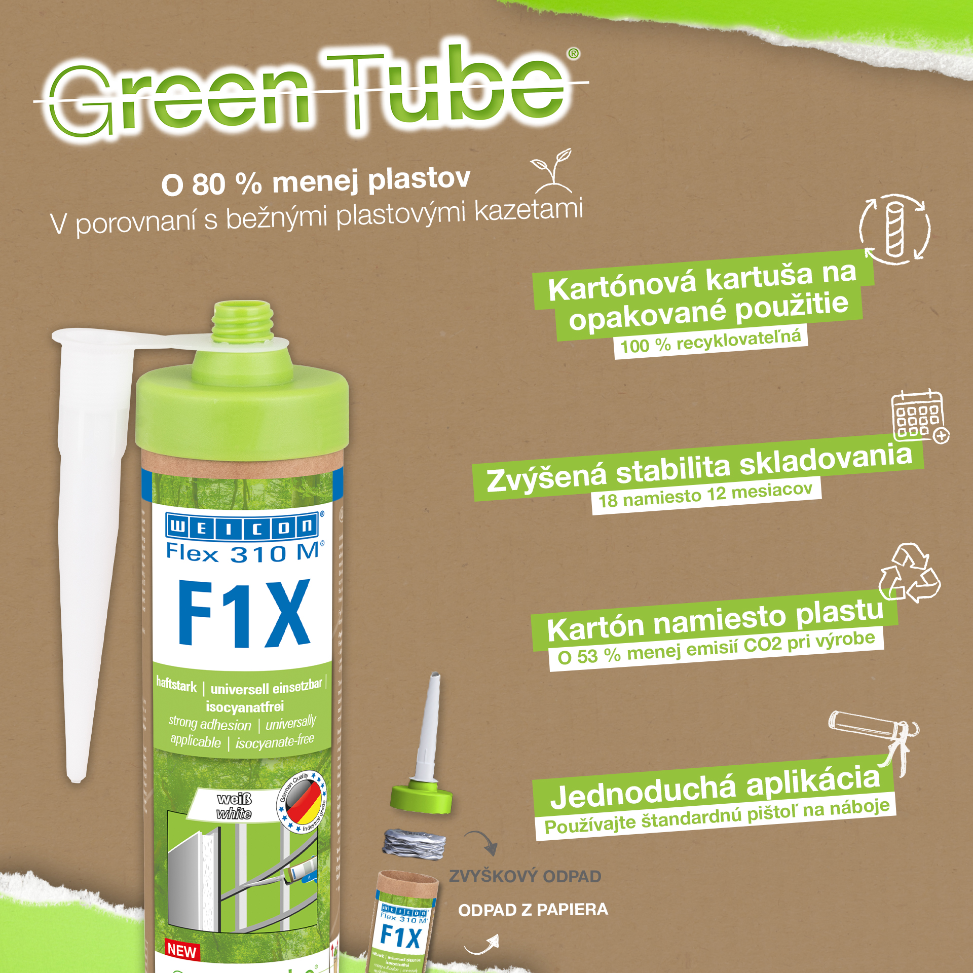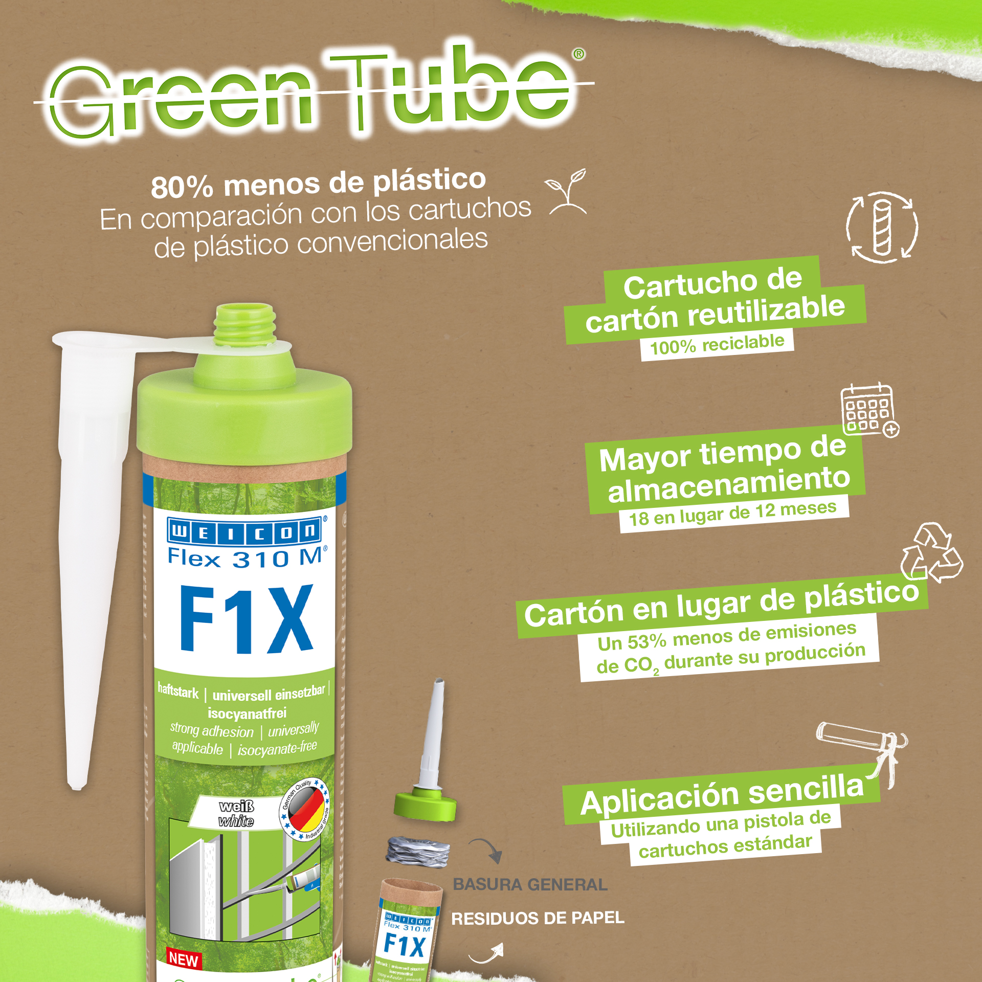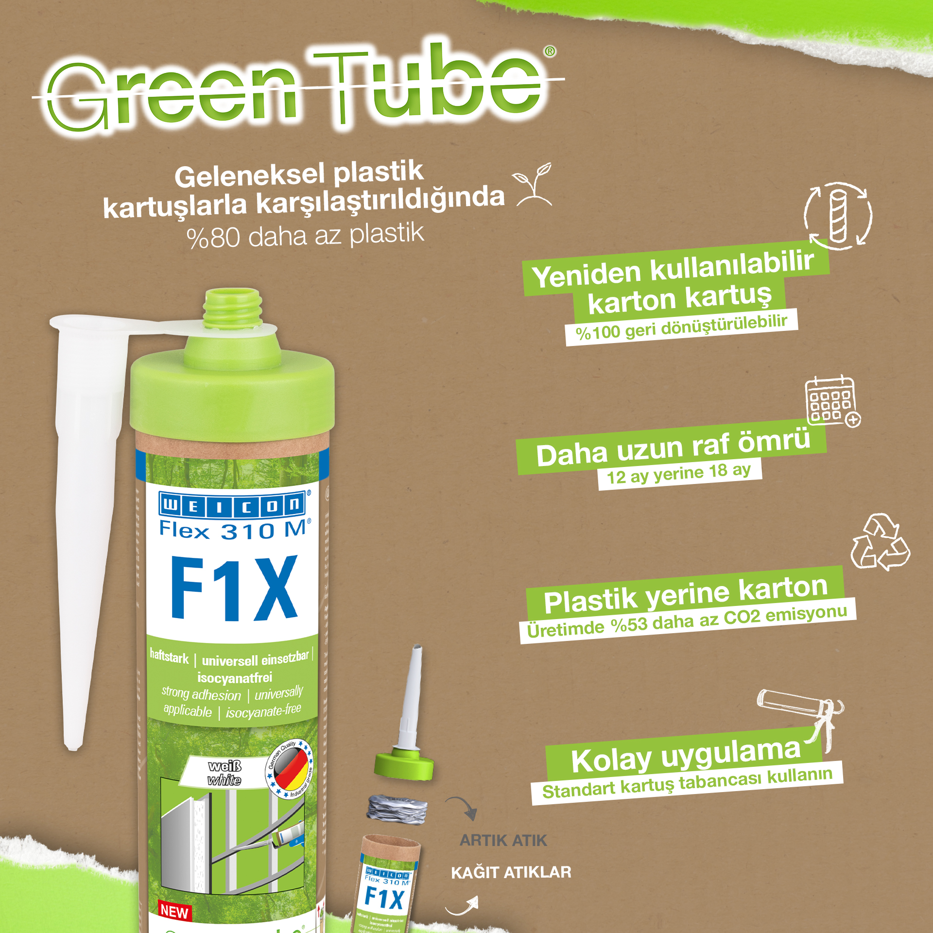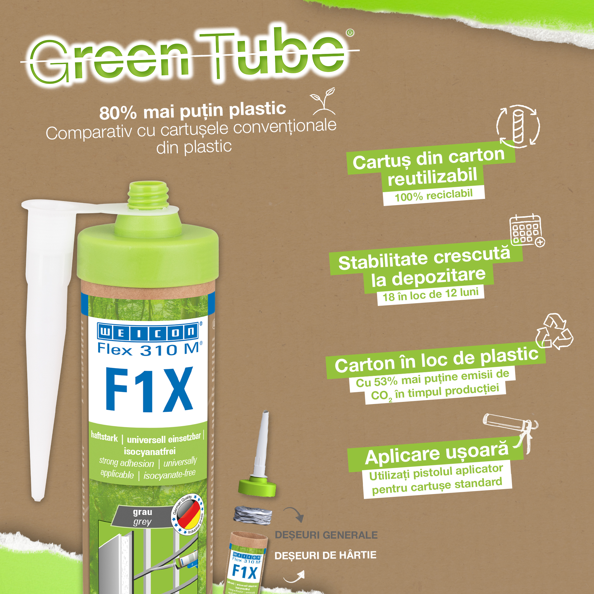 WEICON Flex 310 M F1X is an elastic adhesive and sealant based on MS polymer. The grey adhesive is very strong and universally suitable for permanently fixing almost all materials to a variety of surfaces. Thanks to the very high initial adhesion, bonding is possible on vertical surfaces and even overhead, both indoors and outdoors. For example, Flex 310 M F1X can be used to bond metals, many plastics, ceramics, wood, glass and stone to each other. The permanently elastic adhesive can be painted over “wet on wet”, is sandable, weather-resistant, moisture-resistant, ageing-resistant, mould-resistant and UV-resistant. It is briefly (up to 30 minutes) resistant to temperatures up to 180°C and can be powder-coated after a curing time of four days. The adhesive and sealant is free of silicone, isocyanates, halogens and solvents and is non-corrosive. Flex 310 M F1X can be used for fixing skirting boards, acoustic panels, strips, frames, panels, boards, tiles, stones and EPDM foil. It can be used in drywall and interior construction, metal construction, tank and apparatus construction, container construction, ventilation and air conditioning technology, trade fair and shop construction, yacht and boat building and wherever silicones or products containing silicone are not suitable. Eco-friendly packaging – same strong performance! Green Tube, the sustainable packaging: the tip and lid are made from 100% recycled plastic, and the cartridge body is made entirely of cardboard. This means lower CO₂ emissions and reduced plastic use compared to conventional cartridges – all without compromising on performance!