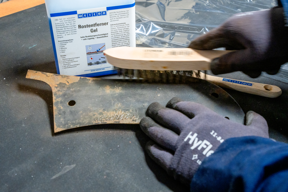 Gel for fast and reliable removal of rust and tarnish. Rust Remover Gel can be used on ferrous steel, brushed stainless steel, copper, brass, chrome and silver. It has a high reaction speed, penetrates very well and is very economical. The gel removes tarnish in just a few seconds. With rust, the removal process can take between 15 minutes and 12 hours – depending on the degree of corrosion. The blue gel does not need to be heated for application but can be used at room temperature. This solution has a natural, solvent-free composition and ensures gentle rust removal. WEICON Rust Remover Gel can be used in various areas of industry and trade.