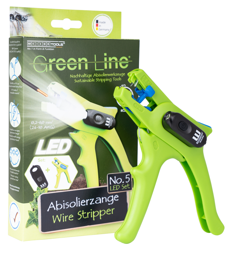 Wire Stripper No. 5 Green Line: Sustainable stripping tool I Space-saving thanks to locking mechanism I automatic wire stripper for all common stranded and solid conductors (0.2 – 6.0 mm²) I very easy to operate I precise working thanks to adjustable length stop (5 - 12 mm) I LED Work Light: the integrated LED light ensures a well-illuminated working area that allows you to work safely with both hands I powerful and rechargeable lithium battery with 180 mAh I 2 hours of bright light (at level 2) after a charging time of 40 minutes I three brightness settings with up to 250 lumens, light colour: 6500K I dustproof, splash-resistant and impact-resistant housing made of polycarbonate, tested acc. to IP65 protection code I can be used with many WEICON TOOLS wire strippers