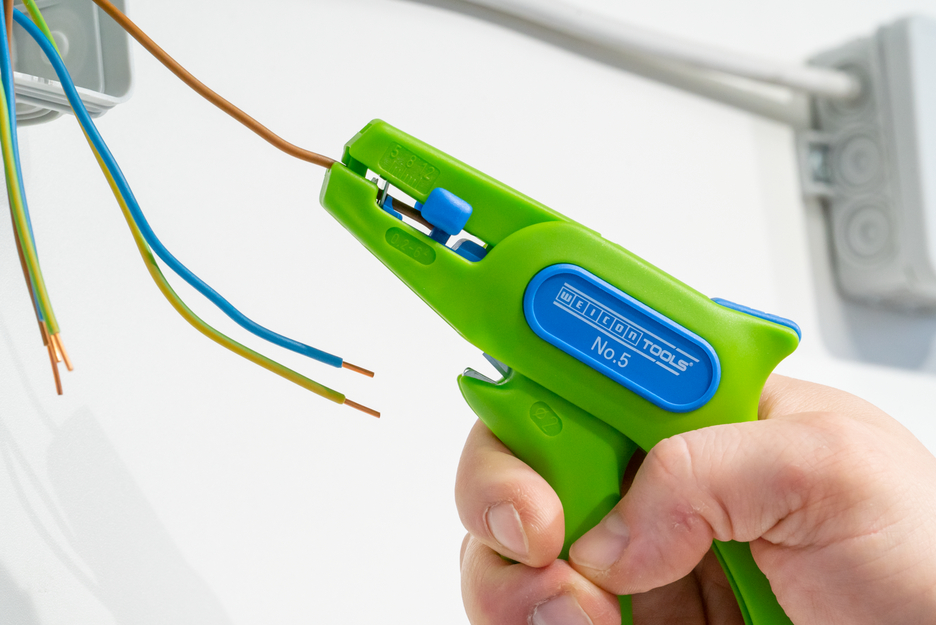 The WEICON TOOLS Green Line is a unique product range specifically designed with sustainability and resource conservation in mind. The Green Line features stripping tools made with up to 97 % renewable and natural materials The WEICON Wire Stripper No. 5 Green Line is suitable for stripping all stranded and solid conductors from 0.2 - 6.0 mm². The wire stripper also has a visual length scale from 5 - 12mm. The length stop can be removed, if required. A well-accessible side cutter is integrated in the tool, which is suitable for cable diameters up to 2 mm. The blades are replaceable. The low weight of the No. 5 ensures fatigue-free working.