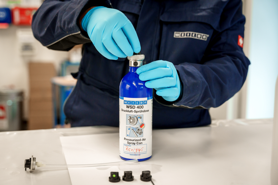 WSD 400 refillable spray can suitable for processing most WEICON Technical Liquids. Filling with compressed air is done by means of an adapter (accessory) via the compressed air network (optimum operating pressure 7.5 bar). The range of accessories for the WSD 400 includes an adapter for filling on any compressed air system as well as a spray set with four different spray heads and a ball valve with suction pipe.